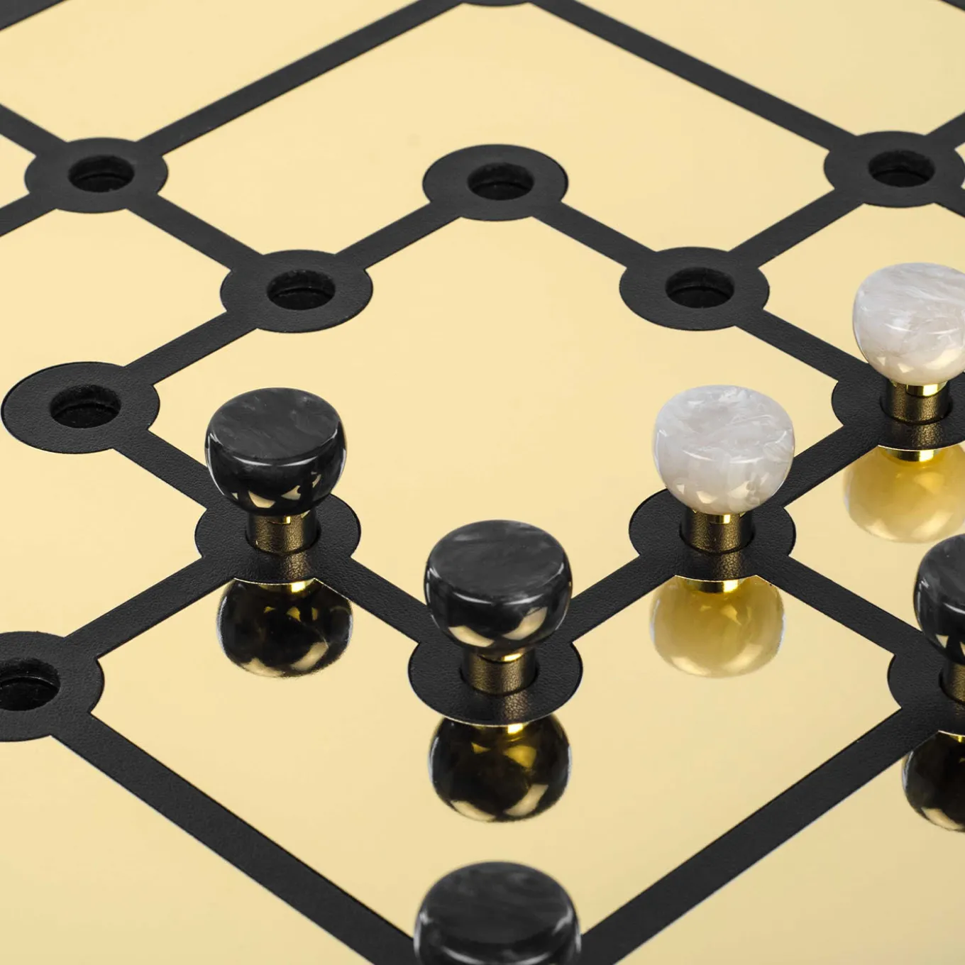 Also known as “nine-man morris”, this design is a luxury variant to play the Mill game. Flanked by two distinct rows of pieces, the game board displays a luxe, golden labyrinthine plate set against a prized backdrop in black leather that envelops the whole square wooden structure. Each piece features a brass base surmounted by semi-spherical elements in black and white faux nacre. A variant with glossy golden segments is also available upon request to the Concierge