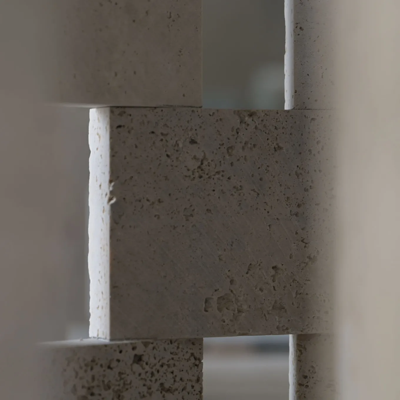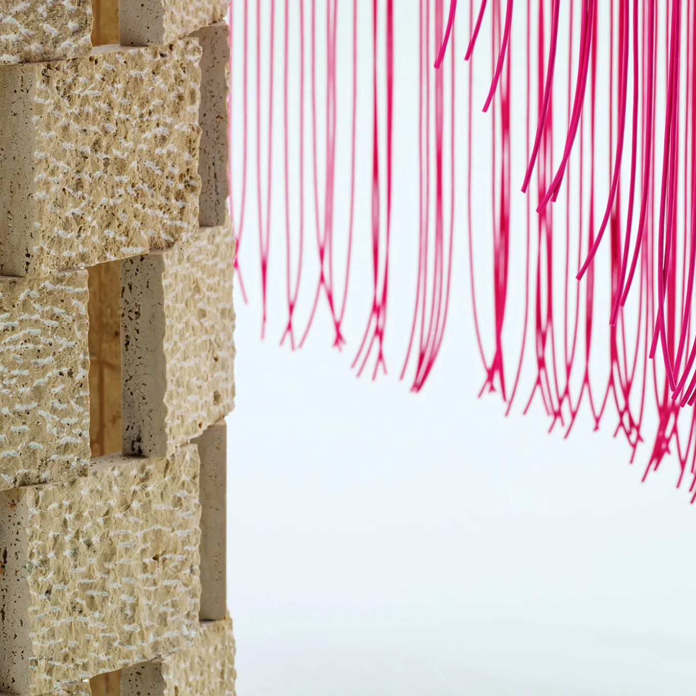 Mimì Dining is a round table of exceptional craftsmanship, designed for outdoor use but perfectly suited for indoor spaces as well. A micro-architecture, a sculpture that bridges art and design. Its essence lies in the fusion of material and technology, handcraft and industry, timeless elements and the reuse of plastic, which becomes the guiding thread of the piece. It is a bold, disruptive, and unexpected collectible, where Ascoli travertine—recovered from the waste of larger productions and reworked using artisanal techniques—rises in striking geometries of solids and voids. Glass embraces a PVC weave (made from quality-control discards of the original granular material), carefully crafted thread by thread. Iron grounds the volumes, all within a revolutionary project where micro meets macro, intricacy meets grandeur, detail meets the whole, and luxury meets upcycling.