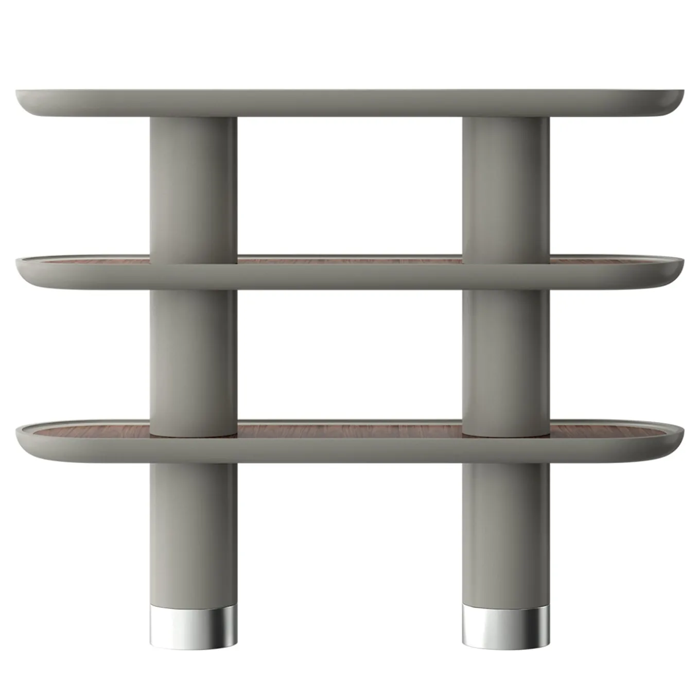 This modern in its clean lines and harmonious contrasts, this bookcase makes for a superb addition to living rooms or studies. A stone gray shade was selected for the lacquered wooden structure, its solid matte coloring standing in elegant conflict with the walnut Canaletto veneer enriching the shelves’ inner surface. Completed by bold cylindrical volume, the bookcase can be customized upon request by the Concierge.