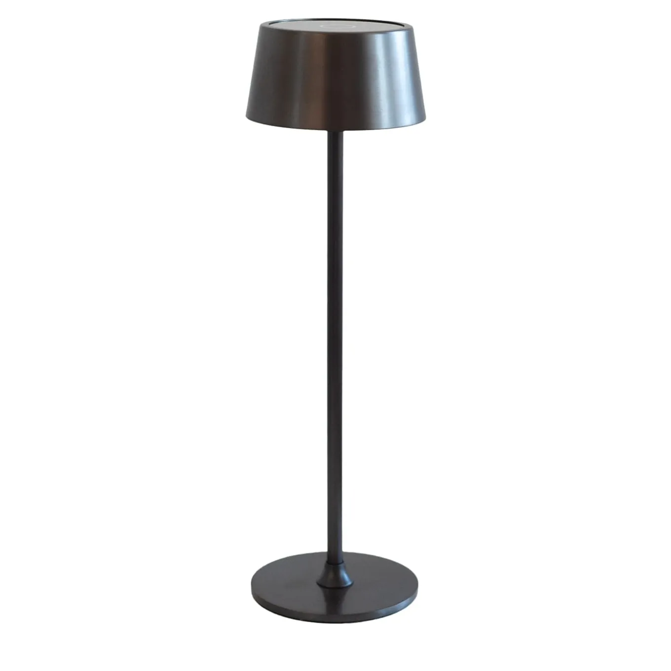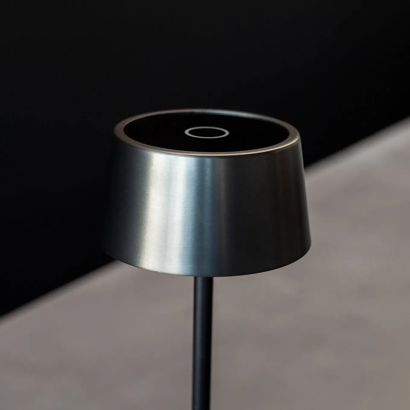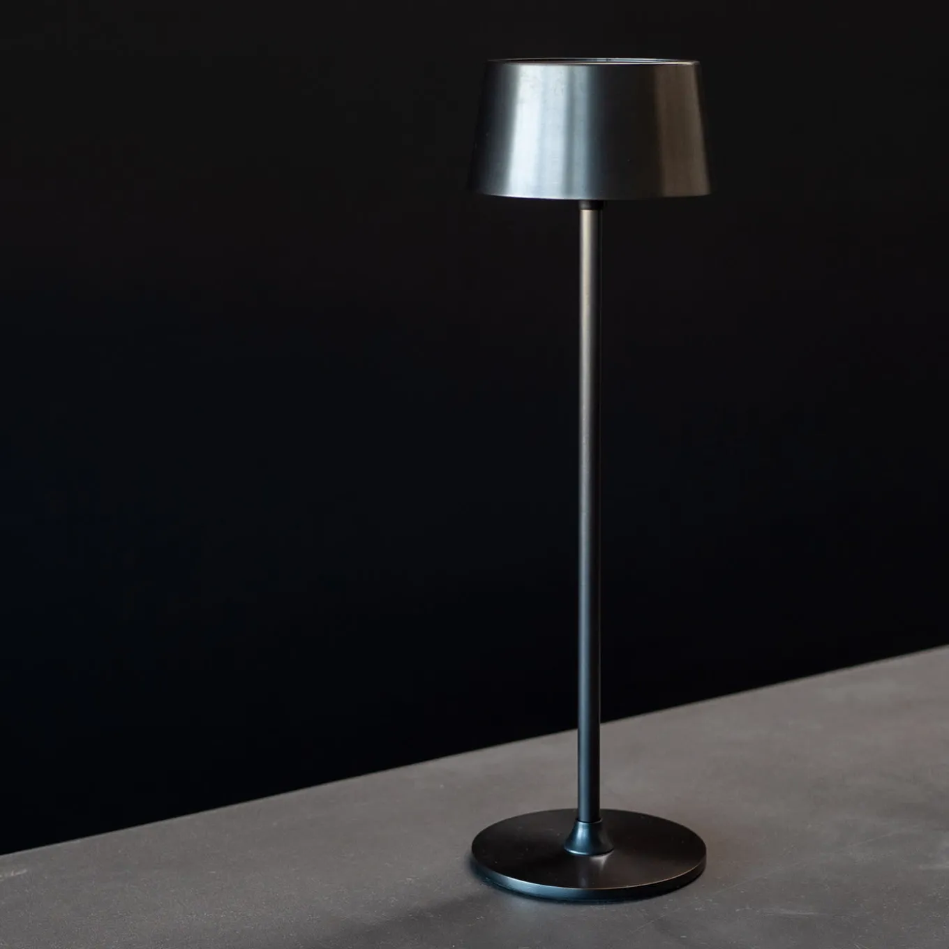 The Mina Rechargeable Table Lamp in anthracite showcases a sleek and contemporary design with a dark, refined finish that complements both modern and classic interiors. Equipped with a 2700K warm LED light, the lamp allows adjustable brightness via a touch-sensitive button on the diffuser. Made of anodized aluminum, it offers excellent durability along with minimalist charm. The rechargeable battery ensures extended use, and a USB-C charging cable is included. Also available in gold and burnished brown finishes, as featured in the Artemest catalog.