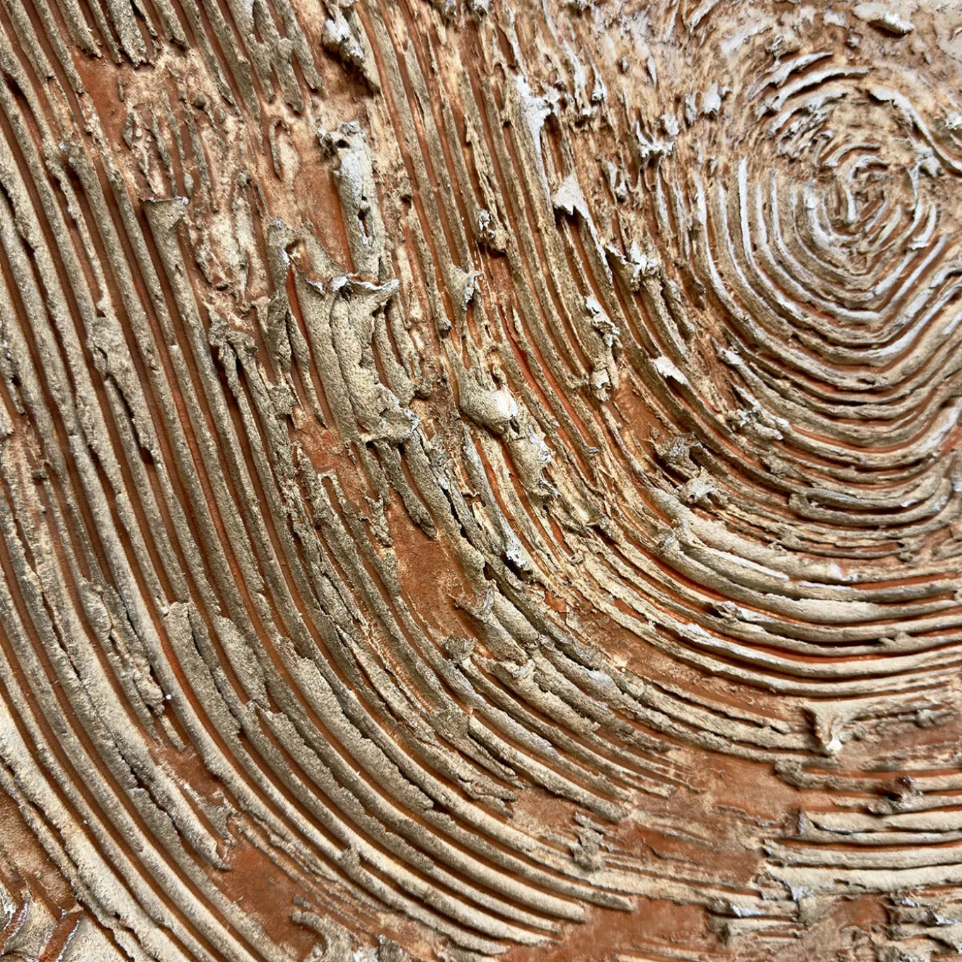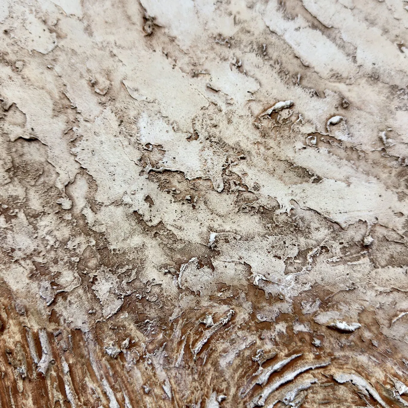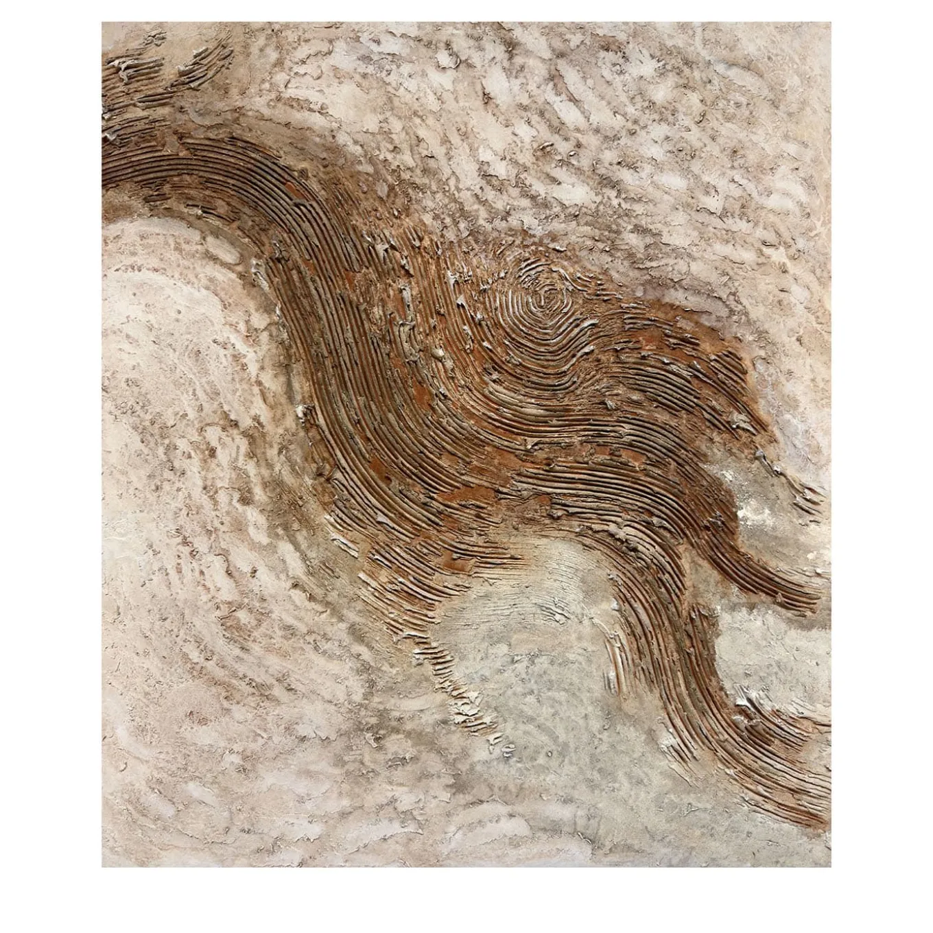 Inspired by crystallized mineral sheets, this work embodies the mystery of the earth’s subterranean secrets. Sinuous ridges rise and fall across the composition, emulating natural fissures and fault lines. The color palette—warm browns, deep grays, and iron-rich ochre—creates a sense of elemental power. The artist’s refined technique blends rough, structured textures with soft, polished areas, making this an immersive visual experience for nature and art enthusiasts alike. One-of-a-kind piece.