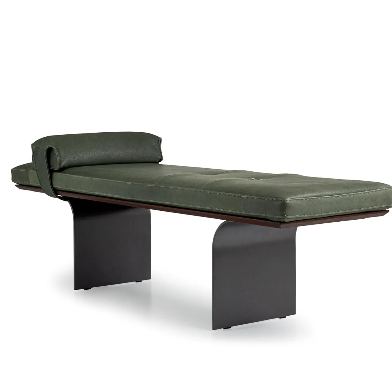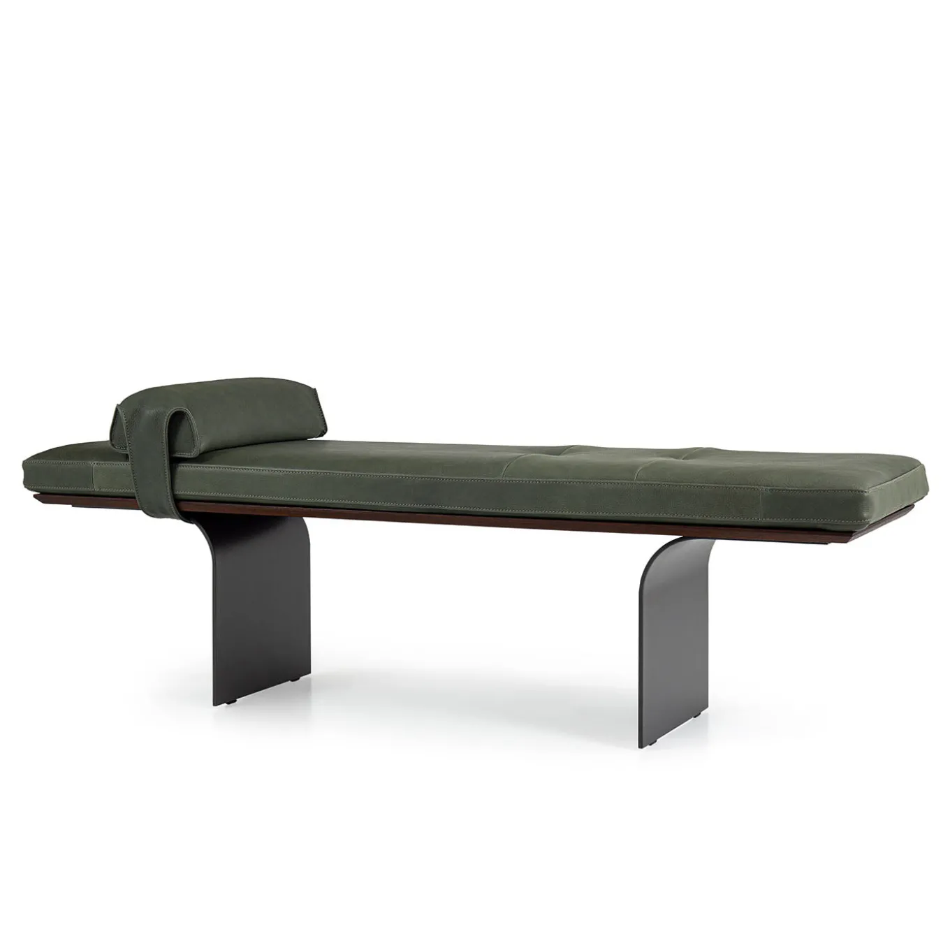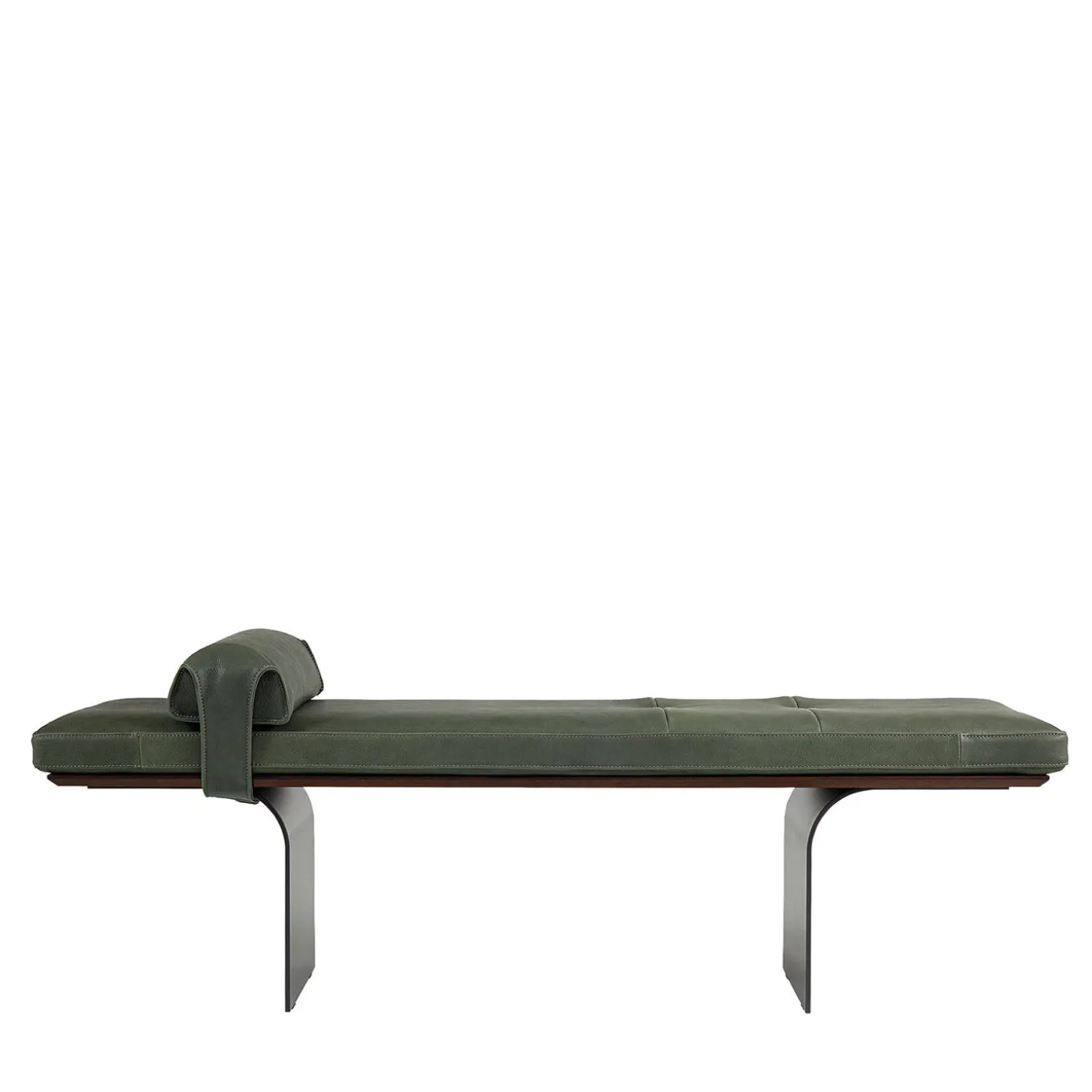 The Minerva bench features an elegant design with a fixed padded polyurethane seat, accentuated by compact zig-zag stitching, and a gently curved backrest cushion. Its structure appears suspended on a base formed by two elegantly curved metal blades, supported by metal feet. Additional finishes and customization options are available upon request. Please contact the Concierge for further information. Design by Andrea Andretta.
