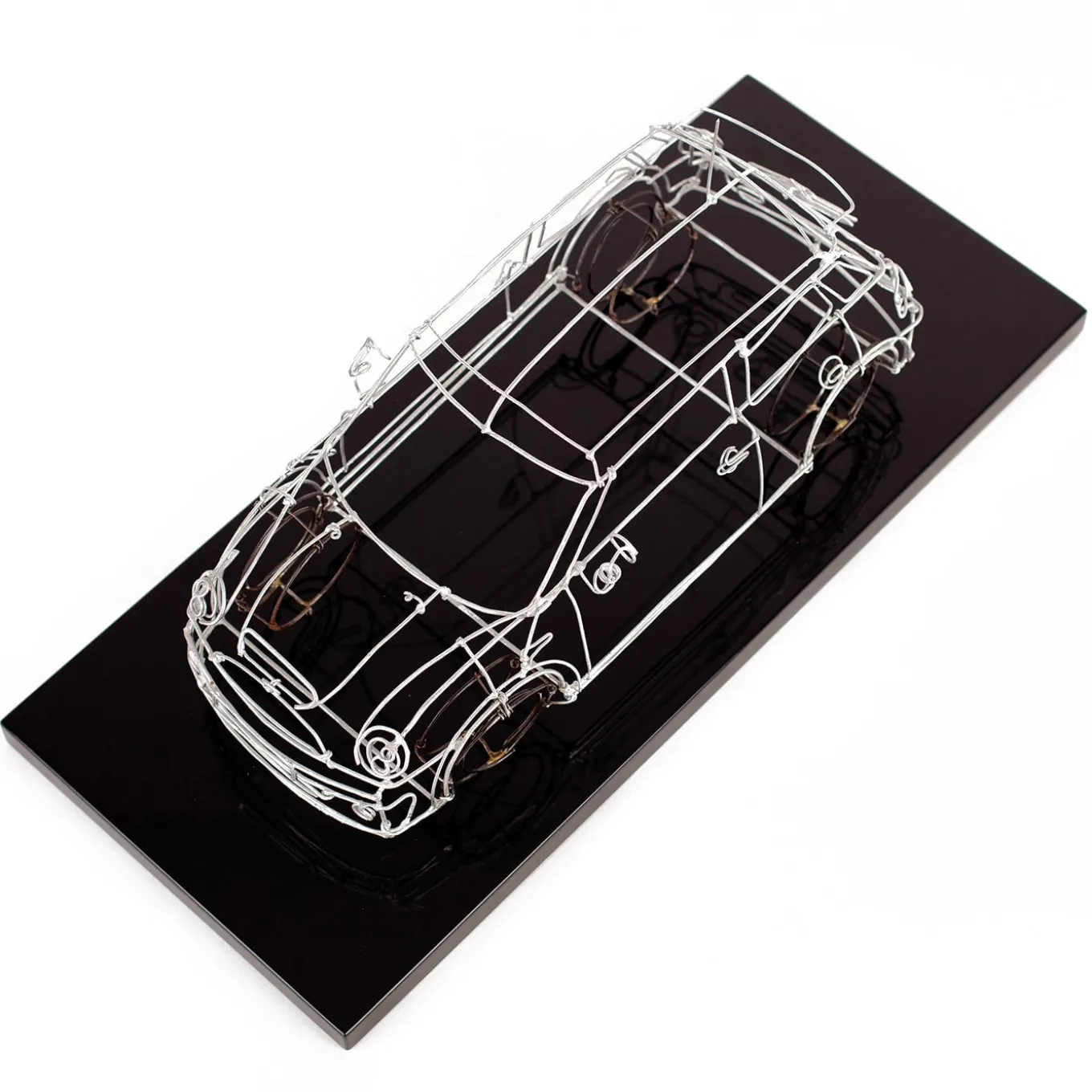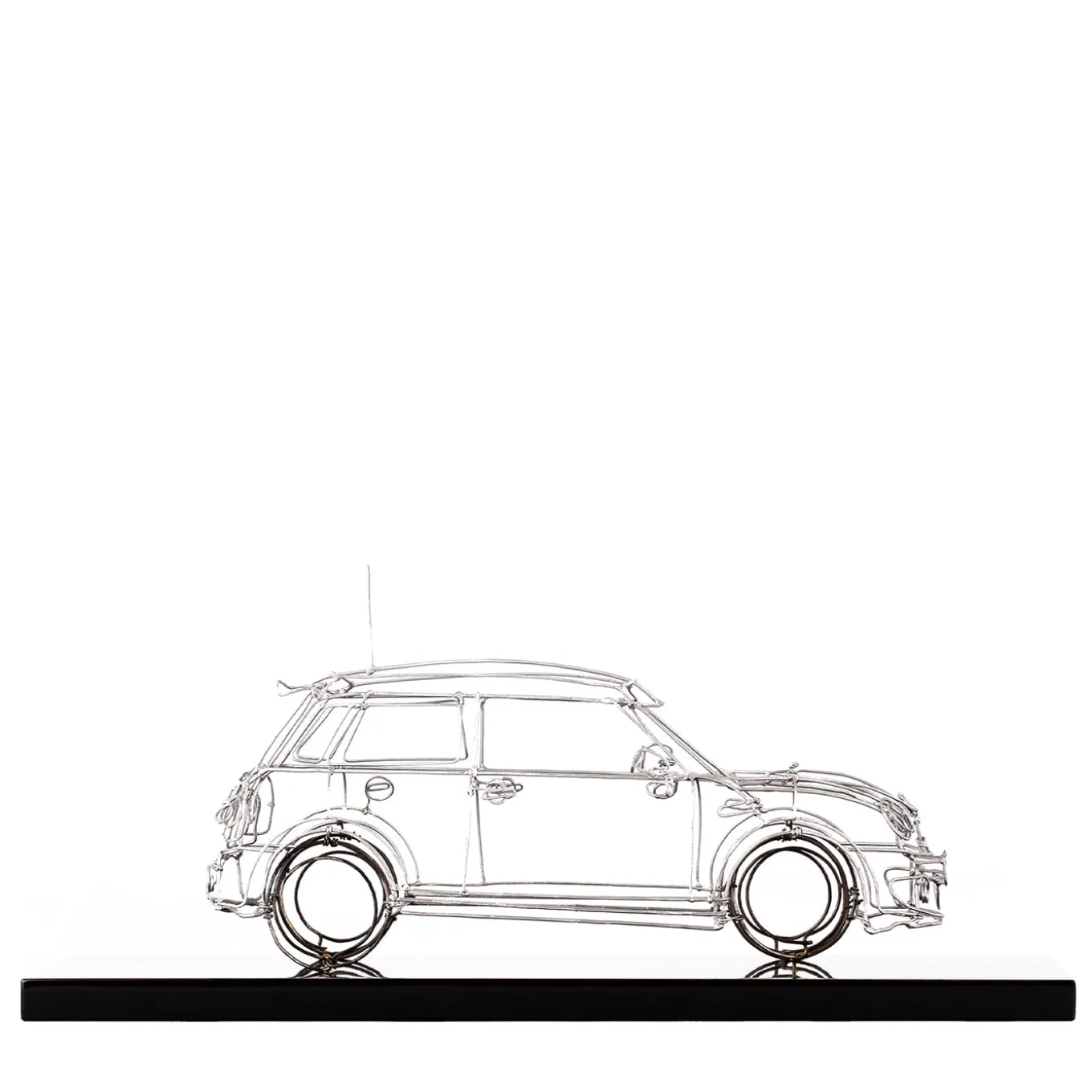 A stylish sculpture of refined contemporary allure, this statuette depicts a Mini Cooper masterfully using silvery-finished metal and black iron wires. Resting on a polished black base, it will make for an exquisite gift idea for an aficionado. The car model is customizable, please contact the Concierge for details.
