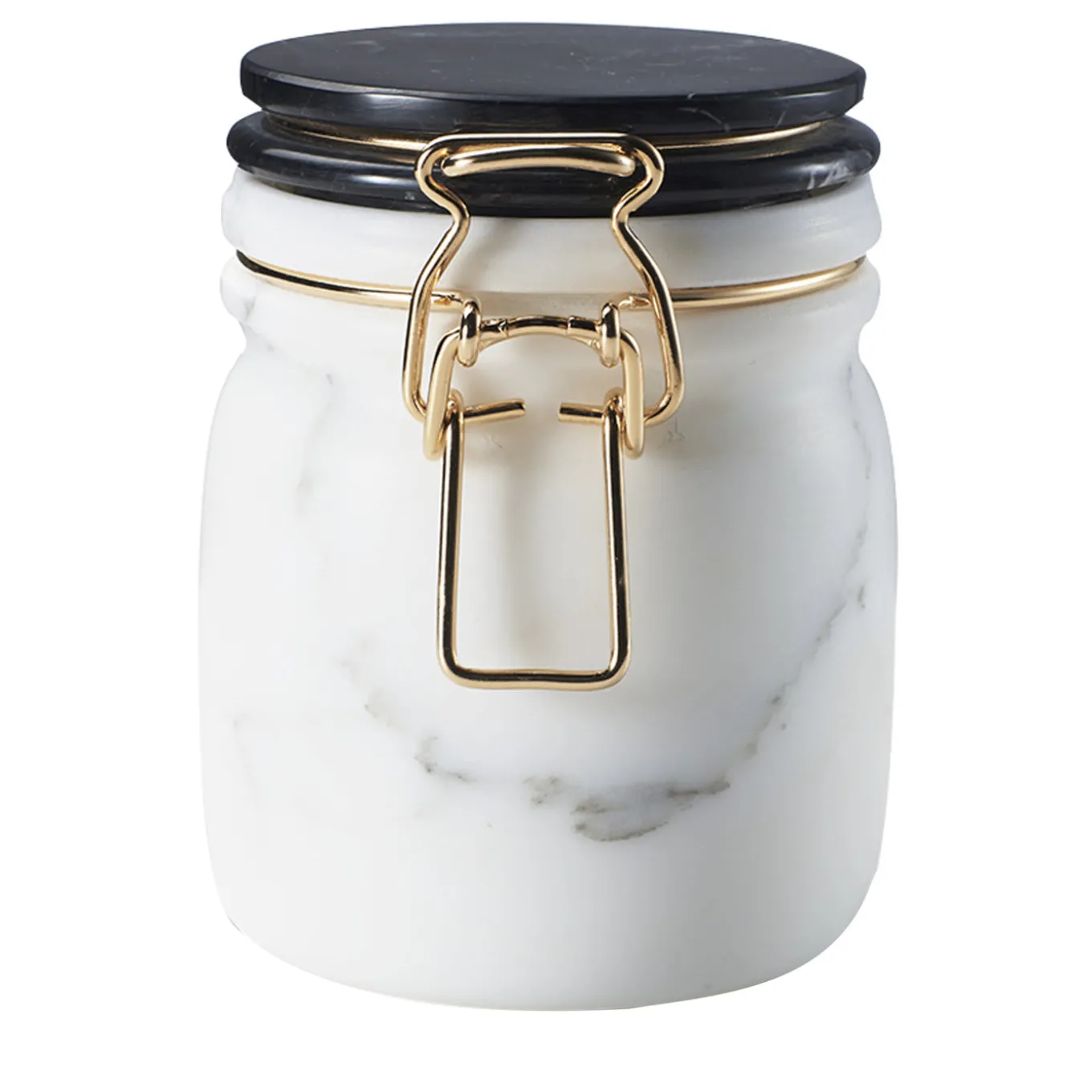 A playful and sophisticated take on the traditional jam jar, this container is crafted using traditional methods and noble materials to add an elegant accent to a kitchen or a living room. The body of the jar is made in opaque Arabescato marble, whose striking natural veins are an exquisite complement to the polished Marquina marble of the top and the brass latch. A one-of-a-kind piece that will make also a stunning gift, this piece can double as unique vase or centerpiece.