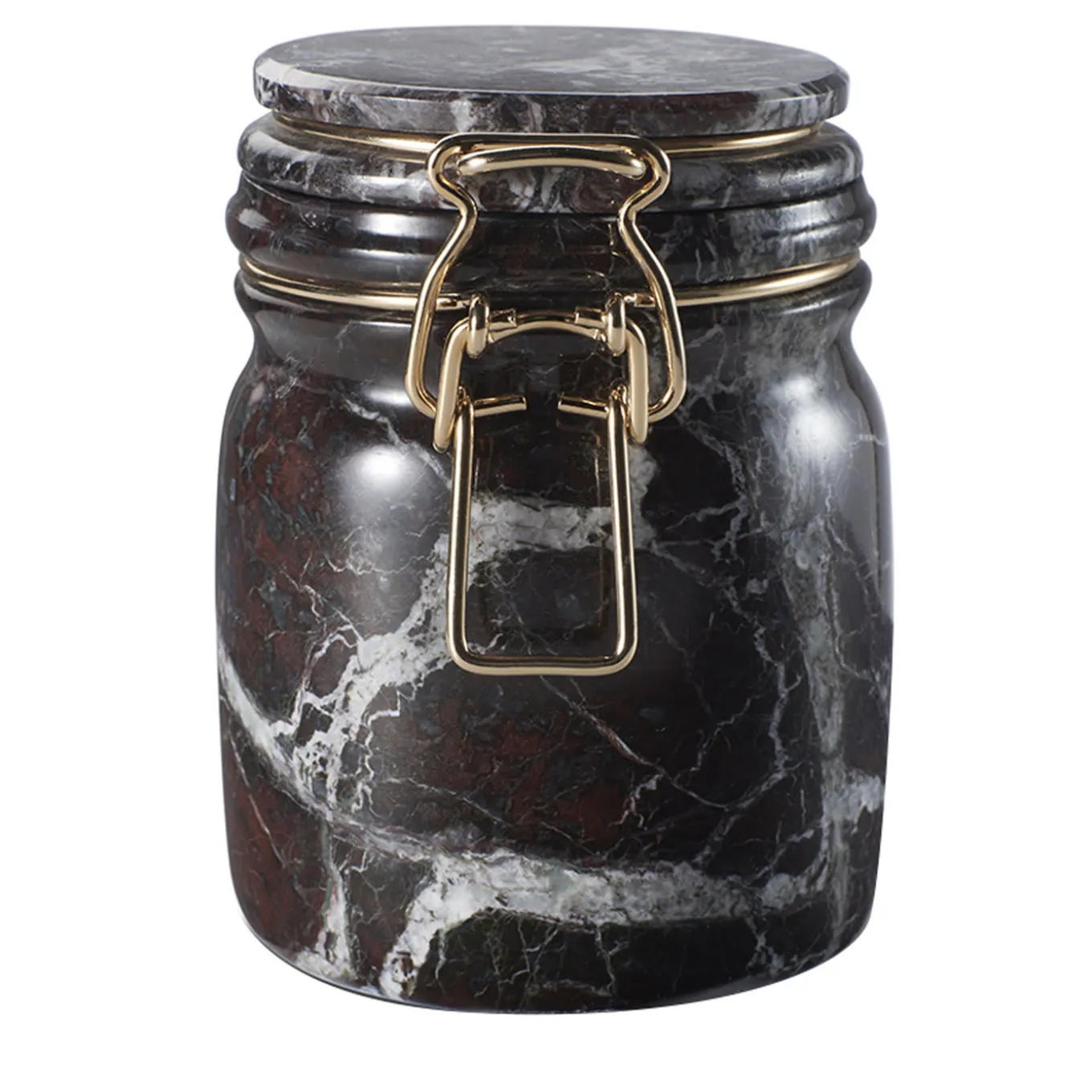 The stunning natural patterns of the Red Levanto marble grace the surface of this jar, shaped in the same volumes of the traditional marmalade jam. This one-of-a-kind piece is finished with a latch in brass that adds a warm and precious glow to it. A wonderful example of traditional craftsmanship mixed with contemporary sensitivity, this jar can be used in the kitchen, or displayed in an entryway, living room, or even bathroom, either alone or combined with other jars in the Miss Marble collection.