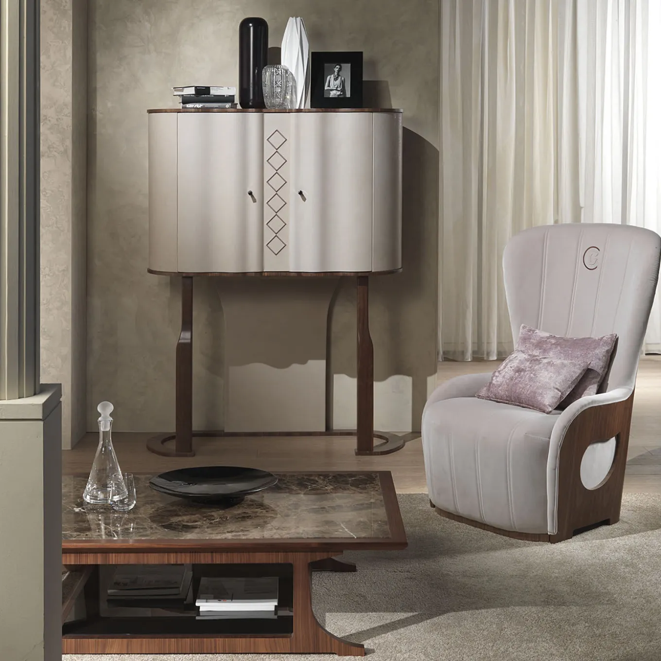 From a boutique collection of complementary pieces, the Mistral Bar Cabinet is characterized by the collection’s signature waves. Crafted in Canaletto walnut, the bar cabinet is lined with supple nubuck leather and accented with geometric detailing. The cabinet comes complete with lighting to ensure easy access to bottles while entertaining.