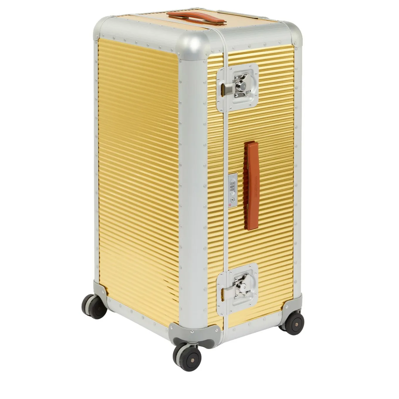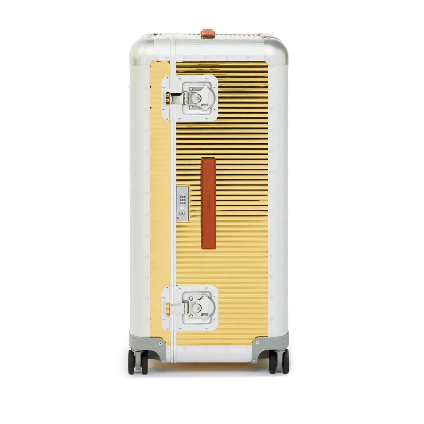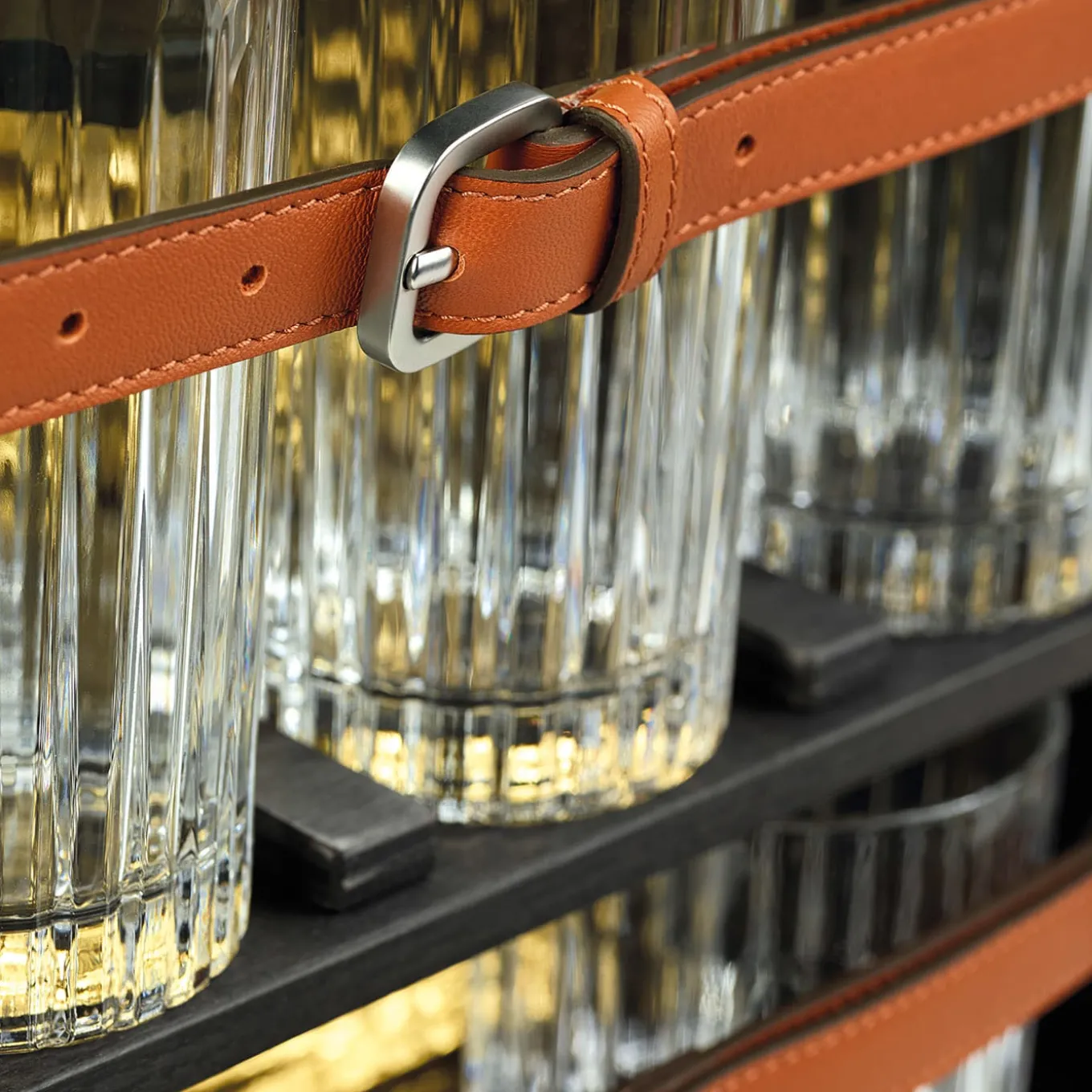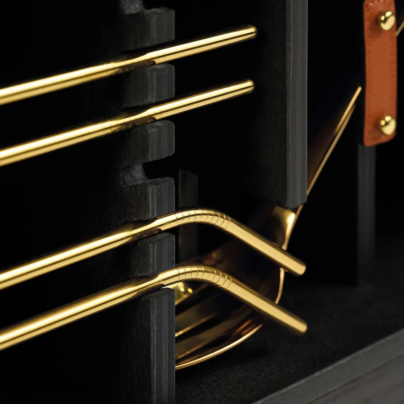 The inside of the trunk features on one side glasses by RCR neatly stored on wooden shelves and individually fastened with a cognac-brown leather strap. On the other side, different housing contains a measuring cup, an ice spoon, a cocktail strainer, a set of straws and bar spoons, a French shaker and a ice bucket, all signed by Sambonet. The shelves in the middle, complete with leather details, are made to hold two Martini cups. There is ample space to store bottles too. You can use the top drawer as a book stand to make the perfect cocktail.