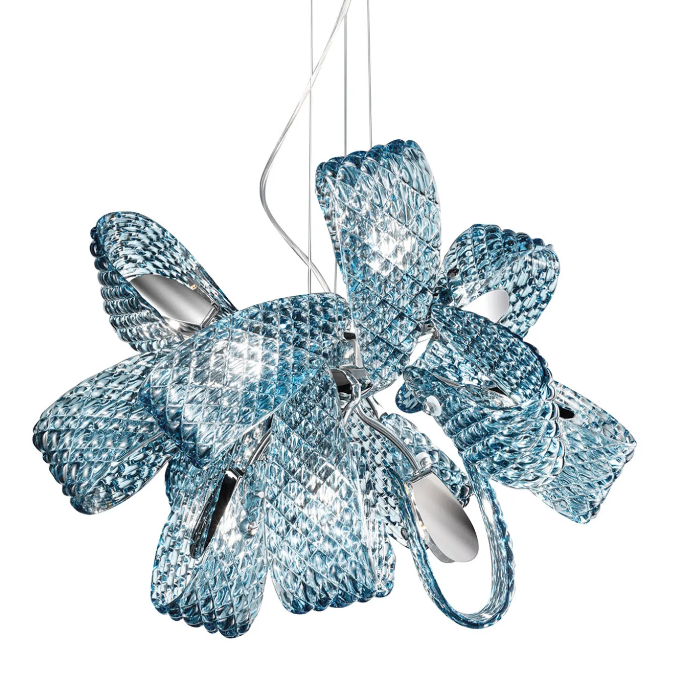 This exquisite chandelier of the Mocenigo Collection will provide a shimmering glow in a unique design that turns glass into a powerful three-dimensional sculpture. Radiating from a polished chromed base (also gold or black nickel upon request), nine arms extend in different directions, each showcasing a gracefully curved ribbon of azure glass with a diamond pattern created with the “a caldo” technique. The light source (G9 max 40W) radiates from the center of each shade revealing the natural brilliance of the glass with mesmerizing chromatic hues.