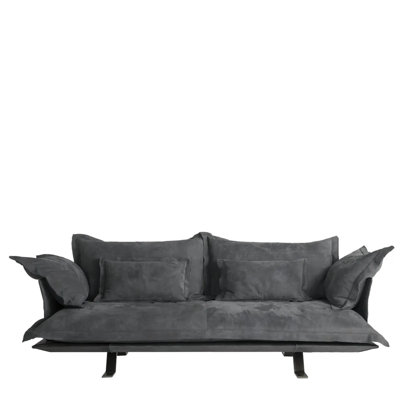 Comfortable and elegant, this sofa is particularly suitable for an industrial or contemporary decor. Its simple frame supports a series of pillows that make seat, back, and armrests plush and cozy, while the nabuck cover adds a sleek and sophisticated touch to the piece. This object of functional decor will make a statement, particularly if displayed in a living room, along with dark or neutral-tone furniture.