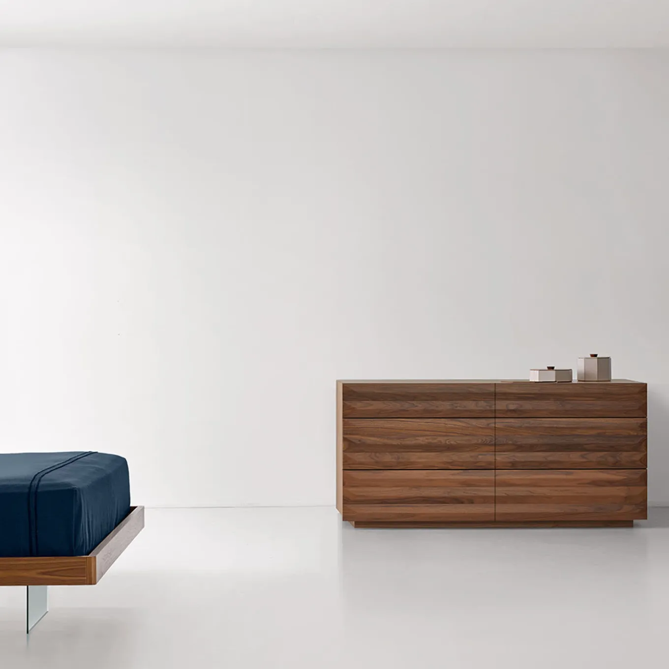 Modi chest of drawers with 6 drawers entirely made in Canaletto walnut. The drawers are also made internally in Canaletto walnut and slide on cushioned guides.
