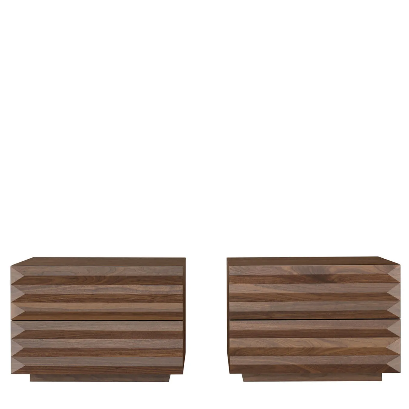 Modi bedside table with 2 drawers entirely made in Canaletto walnut. The drawers are also made internally in Canaletto walnut and slide on cushioned guides.