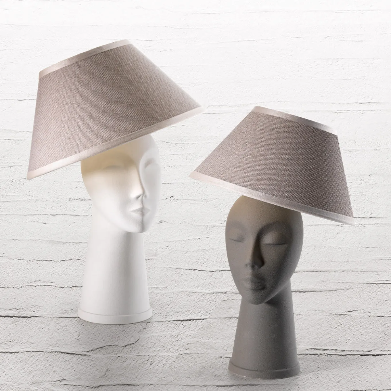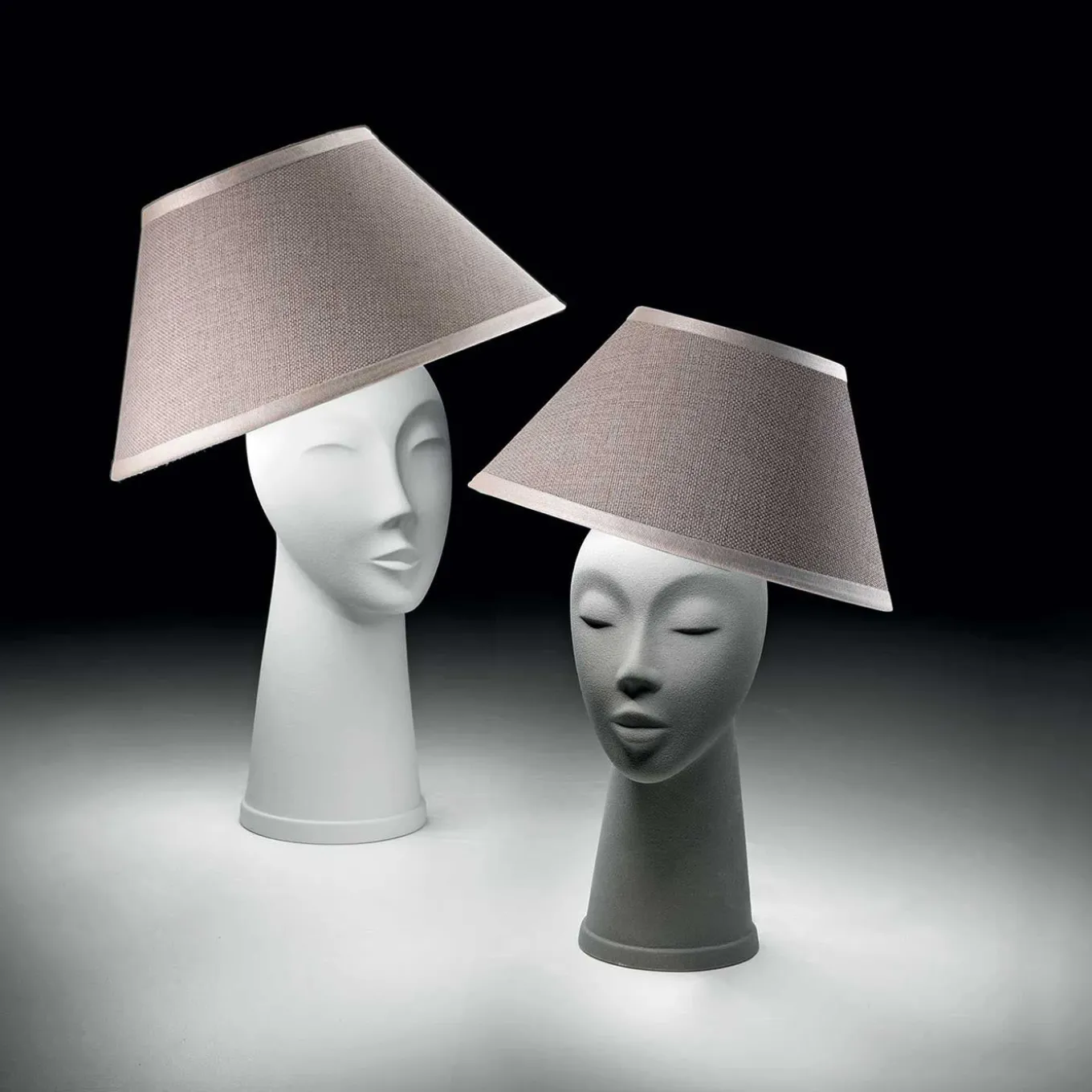 This ethereal, ancestral figure is a lamp that leaves a mark. Its harmonious aesthetic transcends time and eras. The volume and ideal form of its face remains impressive for its balance. Donna Immaginazione (Imagination) has eyes half-closed to dream of new horizons. The LED light in the lampshade lights the figure from the top. The tilted lampshade becomes a headdress.
