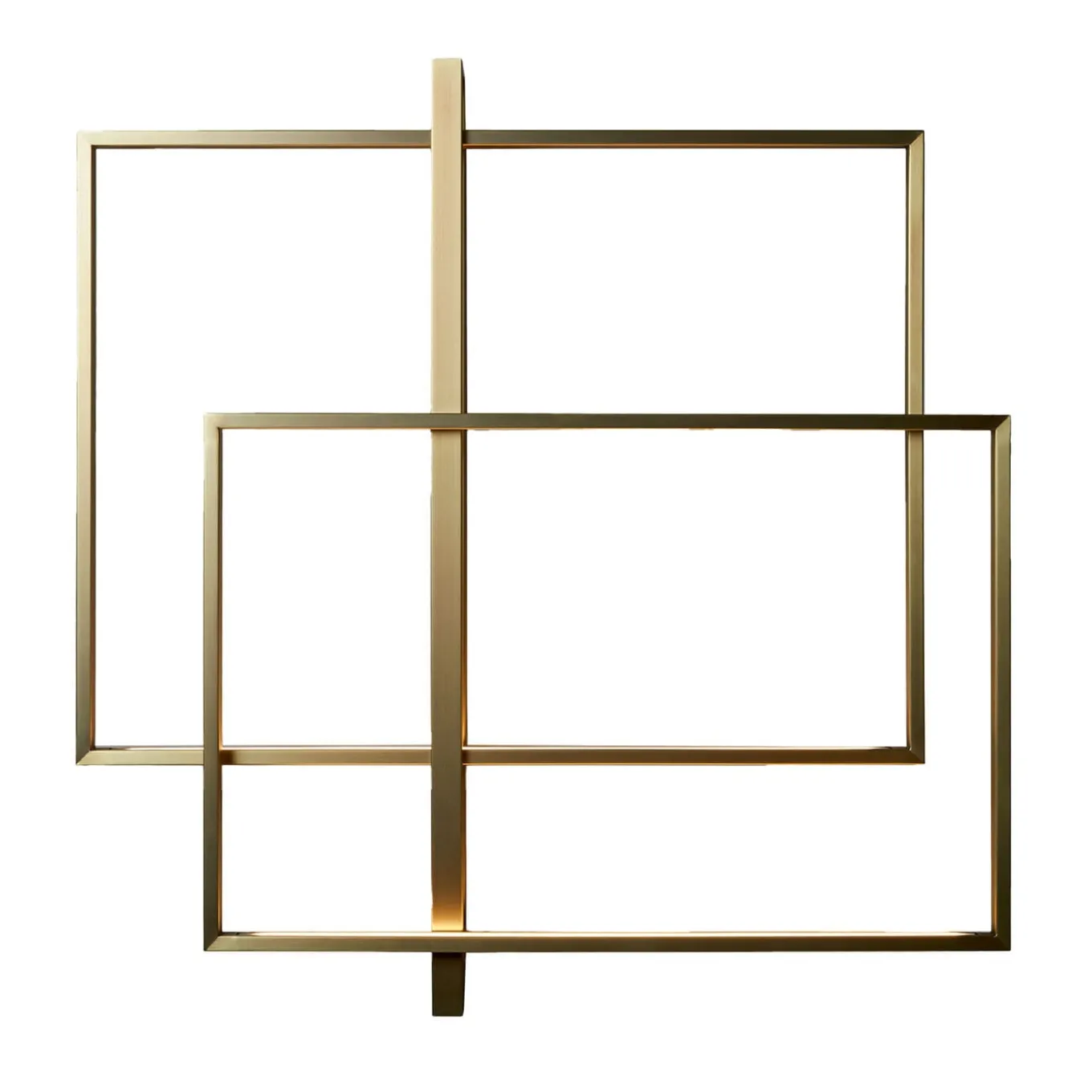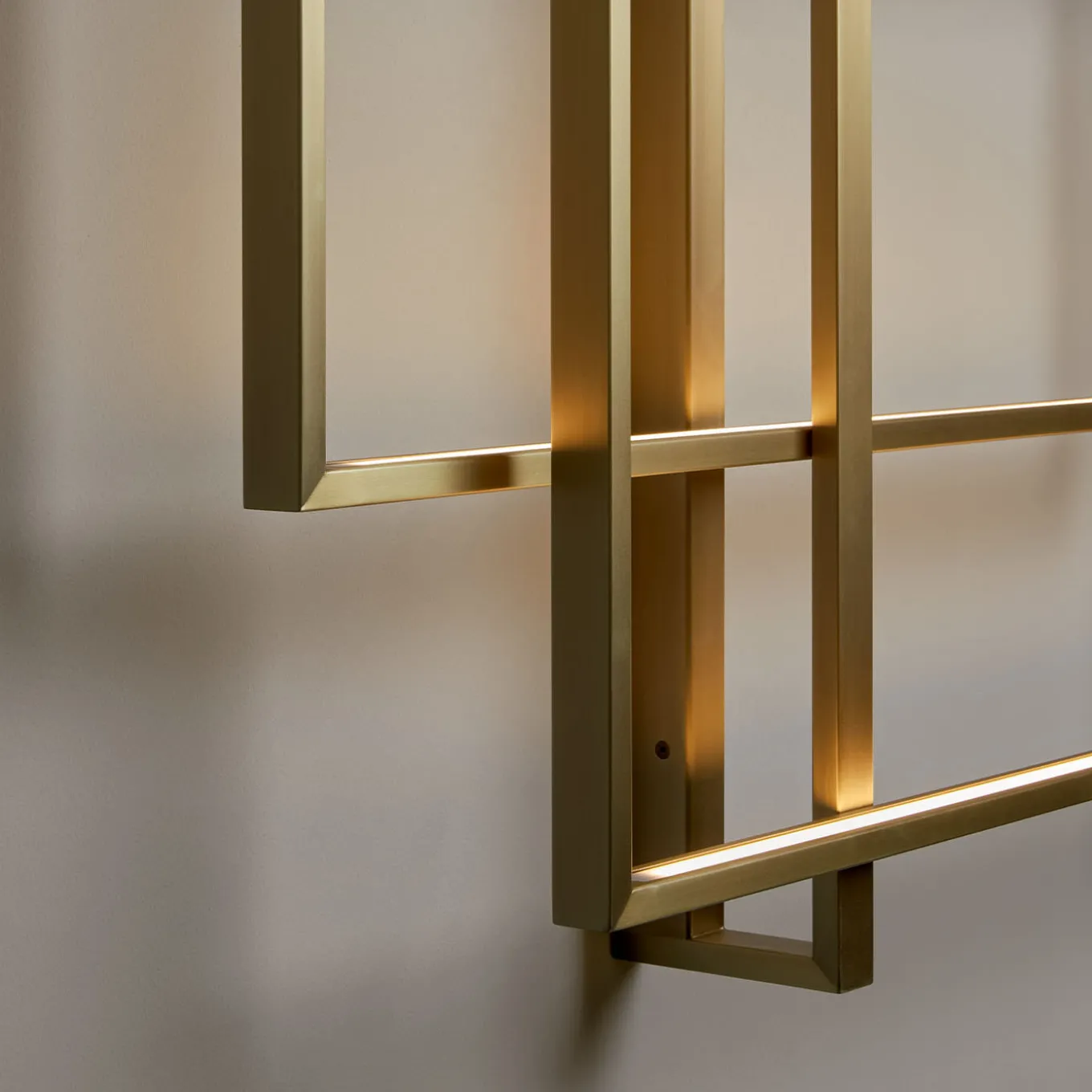 The Mondrian Double Wall Lamp light transforms a solid rectangular form into elegant lines. Three primary shapes intersect, creating precise geometric patterns that emit indirect light from built-in LEDs. It comes in a light-burnished brass finish. Additionally, the Mondrian LED is available in a ceiling-mounted version and different finishes.