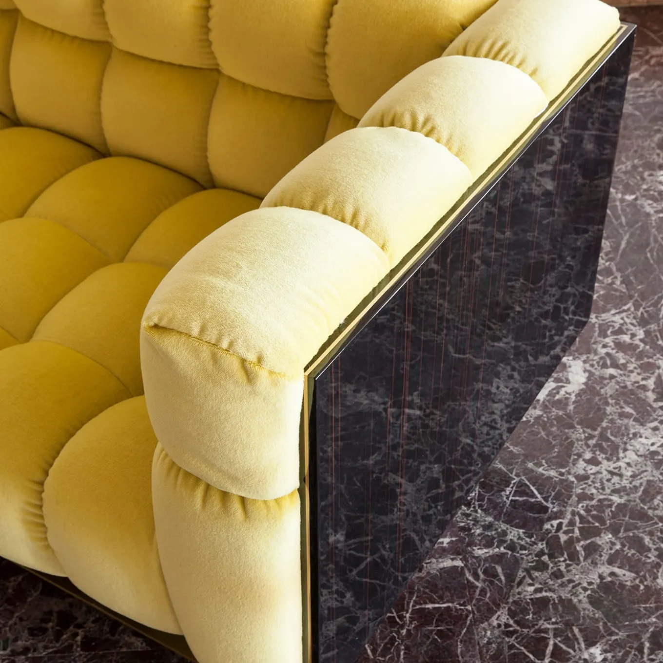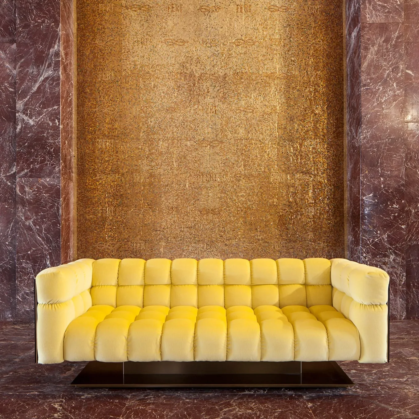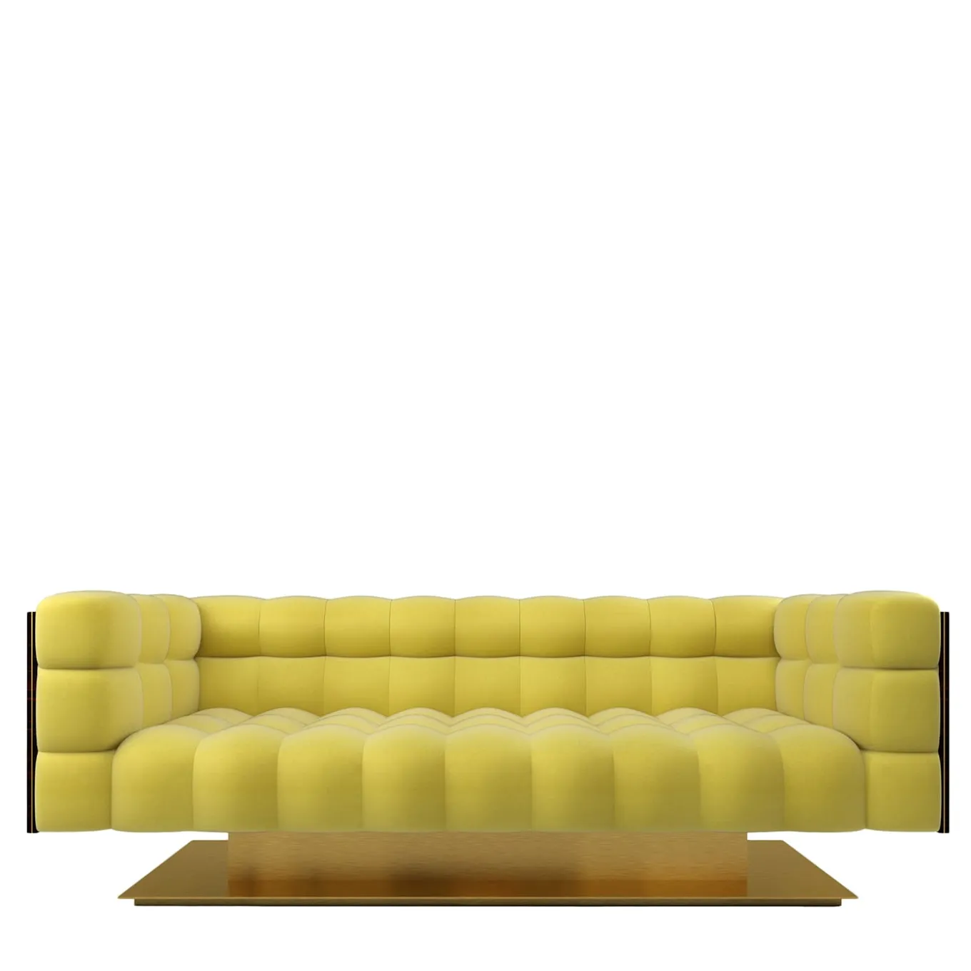Hypnotizing with its eccentric sculptural silhouette, this stylish three-seater sofa is a statement-making design sure not to go unnoticed. The rigorous profiles characterizing the brushed metal base harmonize with the ones tracing the external wooden shell and the extensively quilted seat – equipped with eleastic belts, padded with different-density expanded polyurethane, and covered in vivid yellow fabric. Please explore size and upholstery variants with the Concierge.