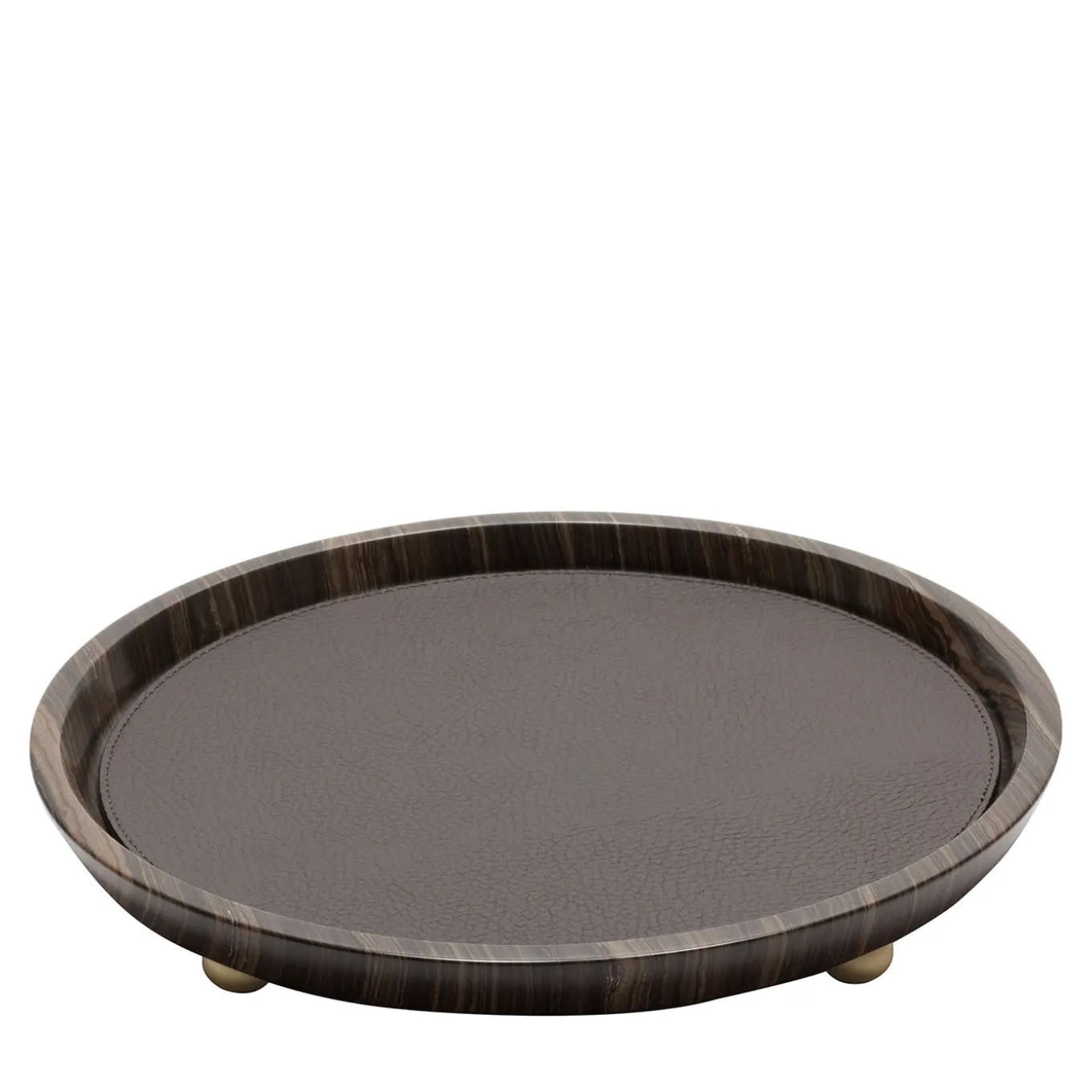 Marble structure with metal rounded feet available in different finishes. Provided with removable leather placemat. Marble finishes available: Arabescato white / green Guatemala / Eramosa brown / black Portoro / Travertino. Metal finishes available: chrome / bronze / brass.