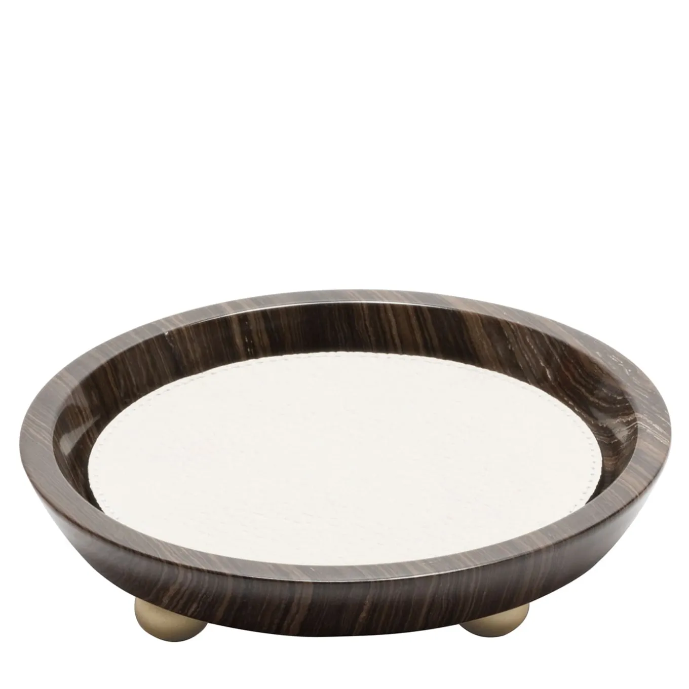 Marble structure with metal rounded feet available in different finishes. Provided with removable leather placemat. Marble finishes available: Arabescato white / green Guatemala / Eramosa brown / black Portoro / Travertino. Metal finishes available: chrome / bronze / brass.