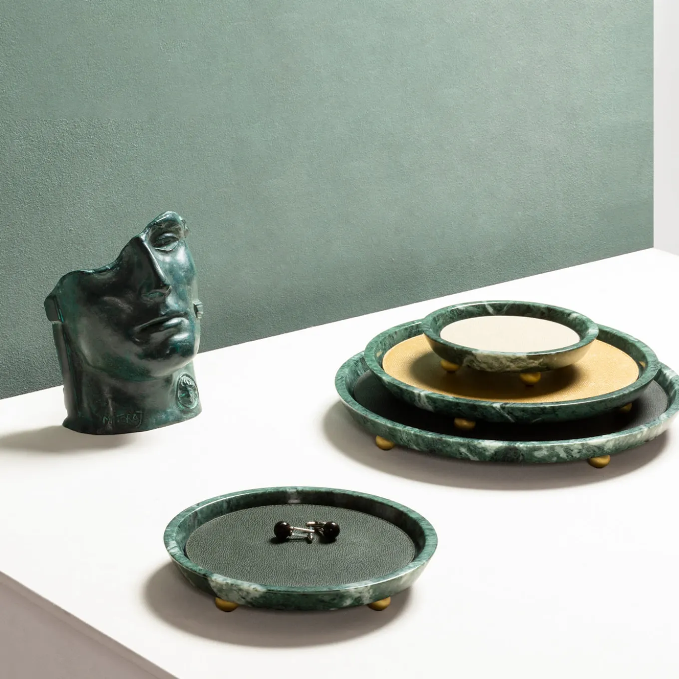 Marble structure with metal rounded feet available in different finishes. Provided with removable leather placemat. Marble finishes available: Arabescato white / green Guatemala / Eramosa brown / black Portoro / Travertino. Metal finishes available: chrome / bronze / brass.