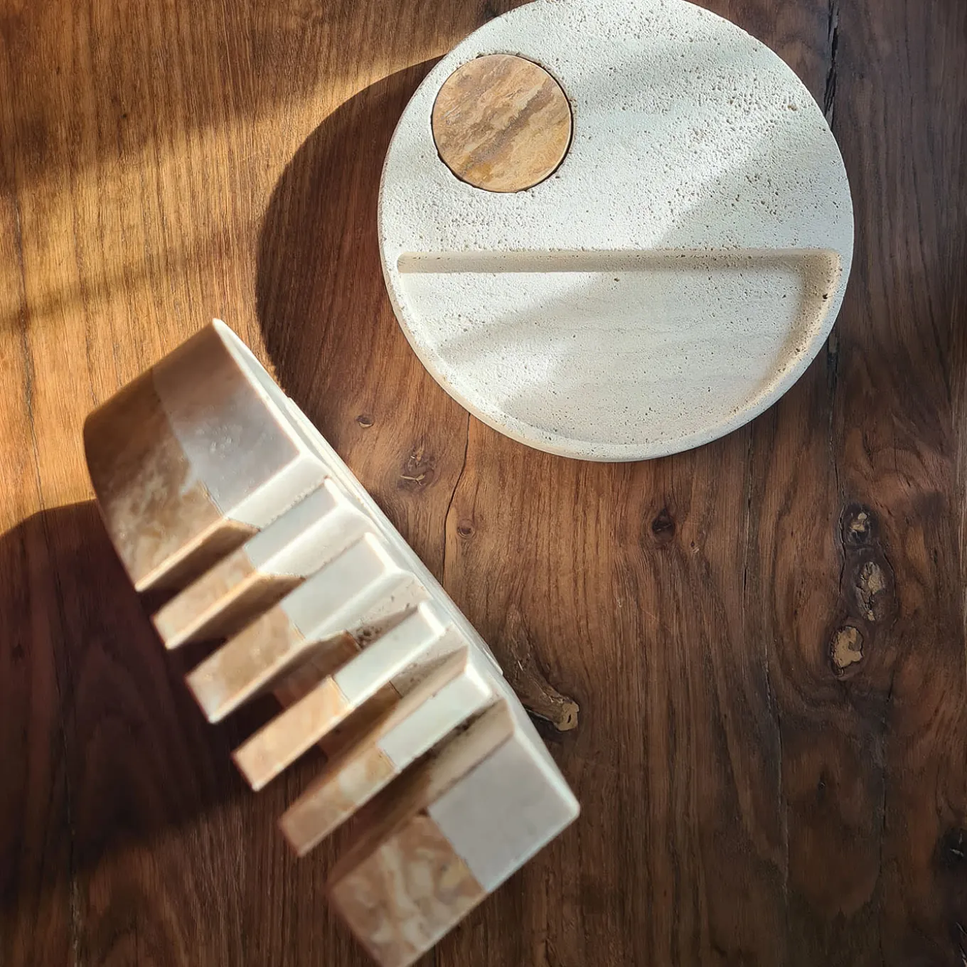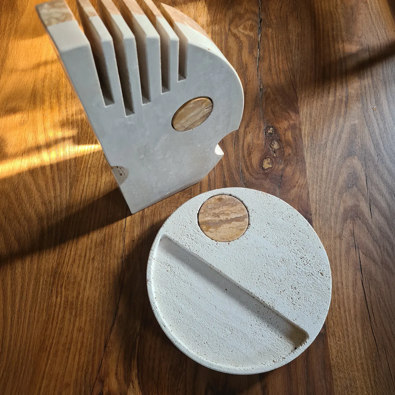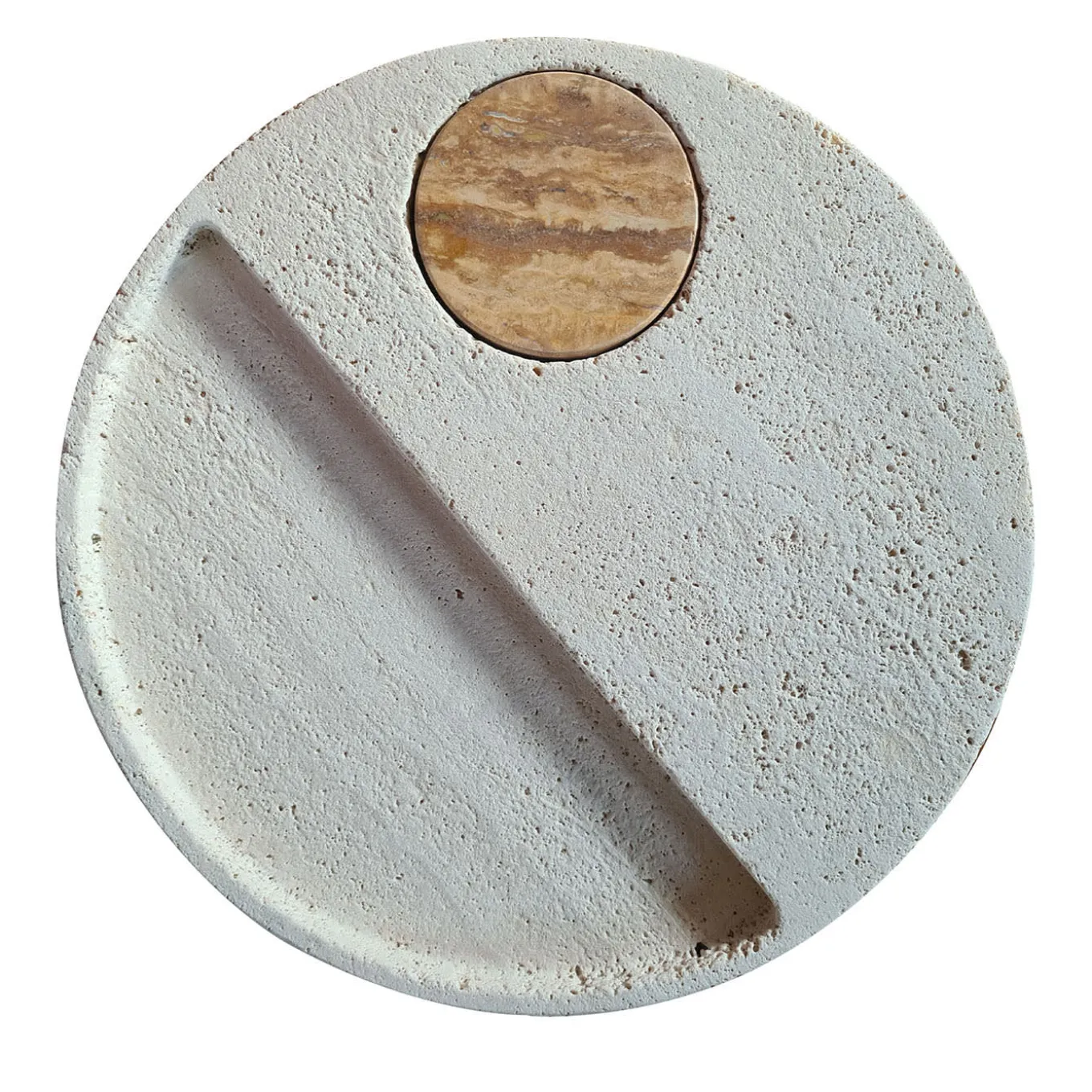 This aperitif tray from the Convivio collection is a testament to ancient craftsmanship. Crafted from Roman travertine with a refined sandblasted finish, a carved groove holds snacks, while the removable round insert offers a spot for glasses or bowls. The round disk can also be used as a coaster, enhancing its functionality. Perfect for entertaining, this piece marries functionality with timeless elegance.