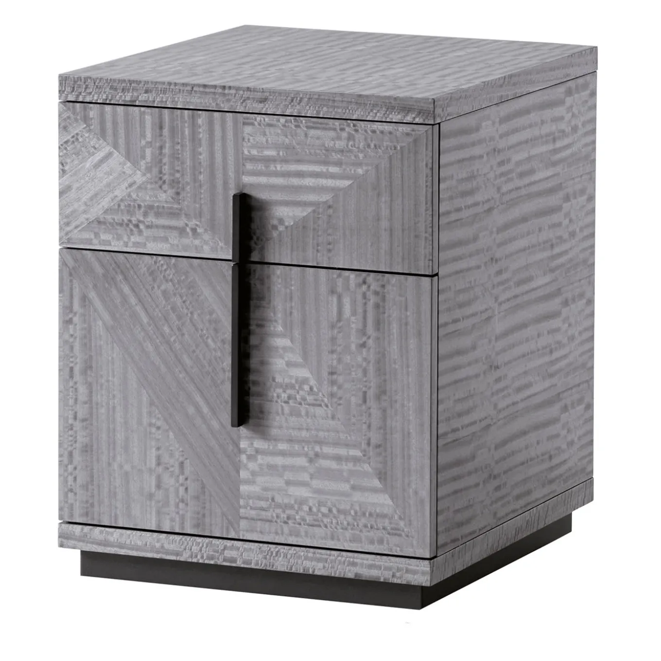 File cabinet on wheels in inlaid Tasmanian curly Eucalyptus veneer with high gloss polyester finish. 1 full extension drawer with bottom part in velvet fabric and 1 file drawer. Base and handles in satin grey nickel stainless steel.
