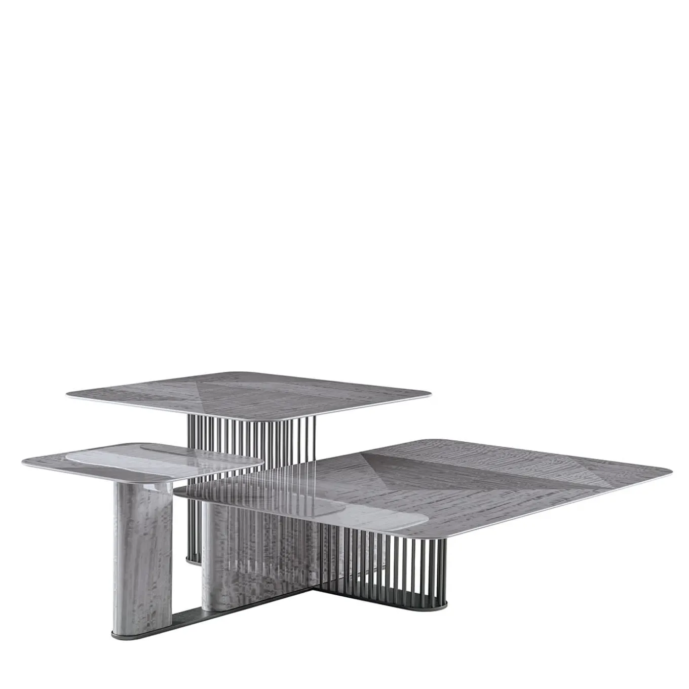 Three levels cocktail table with tops in inlaid Tasmanian curly Eucalyptus veneer with a high gloss polyester finish. Base made of a combination of satin grey nickel stainless steel and Tasmanian curly Eucalyptus veneer with a high gloss polyester finish.