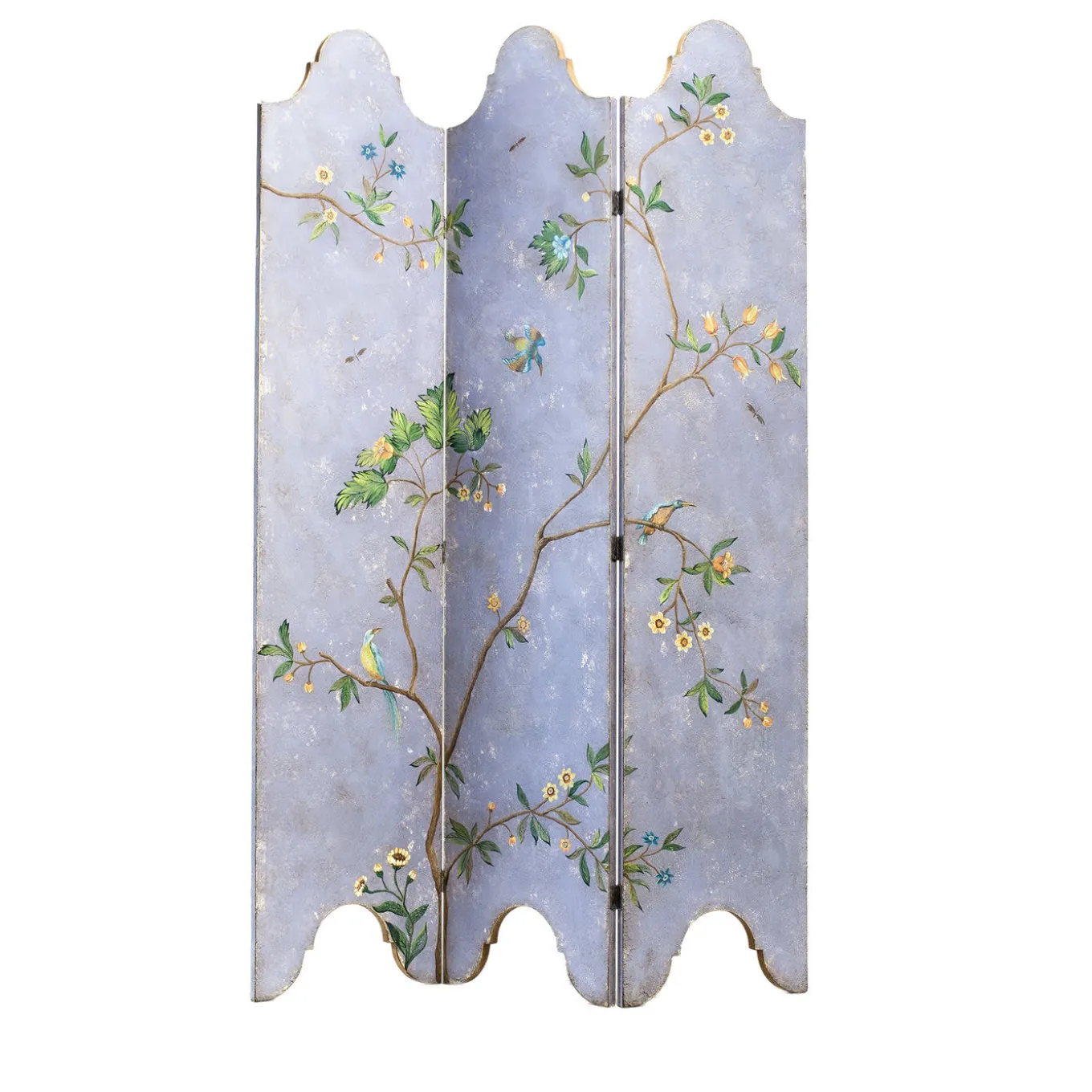 Evoking the silhouette of the Palladian windows, with a broad arched central section, this stunning screen is a sophisticated choice to divide and define space in a large interior. Composed of three hinged wooden panels hand painted with a verdant frond motif on a pale blue background, this captivating piece of functional decor displays an antiqued finish that calls to mind the frescos of the Venetian palazzos. In order to perfectly coordinate with specific interiors, colors and decorations can be personalized upon requests, as well as number of panels and size.