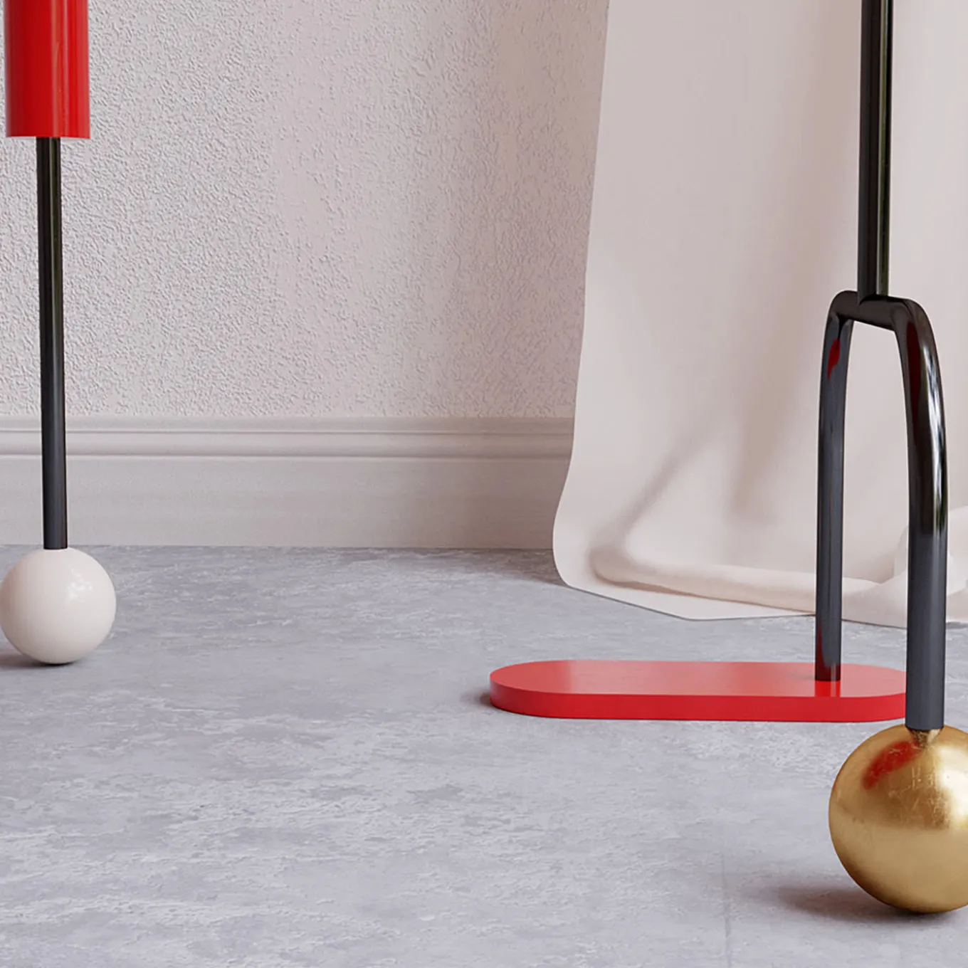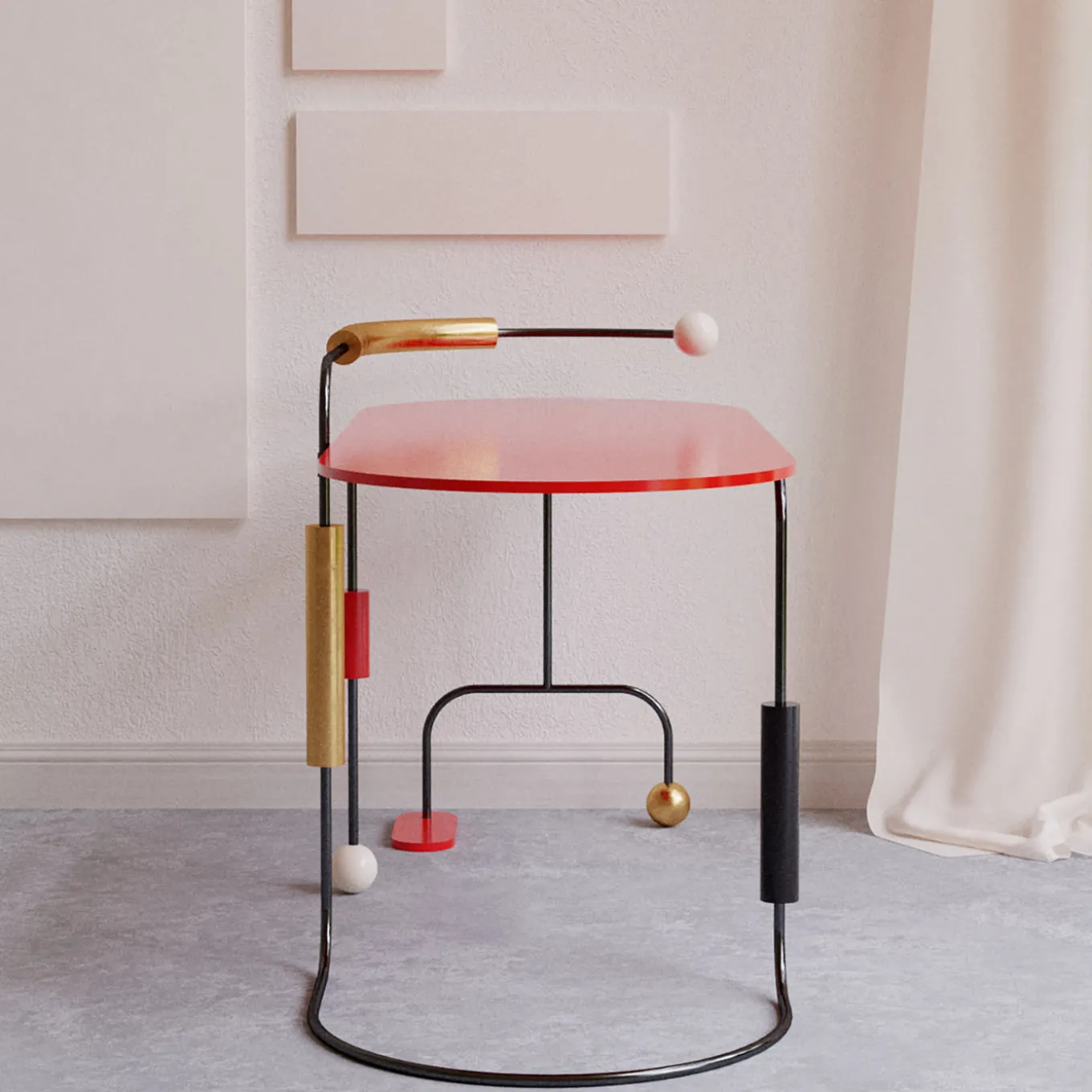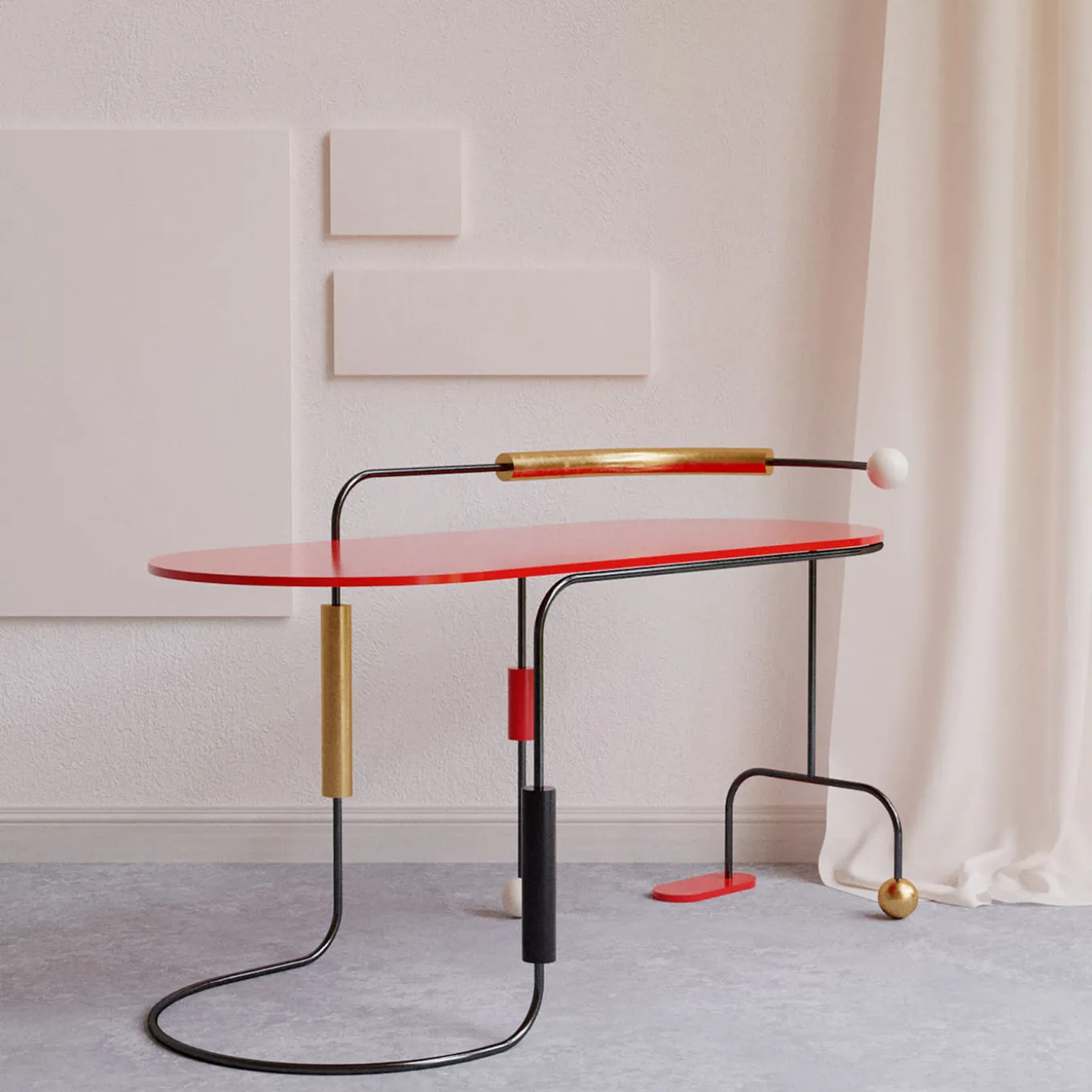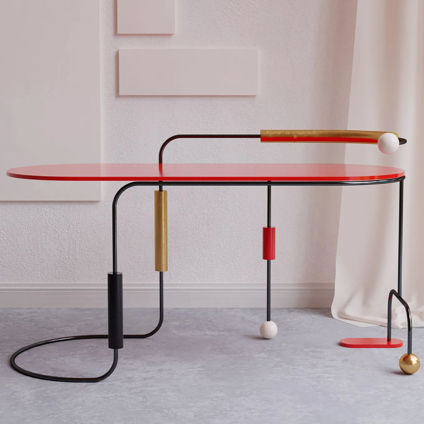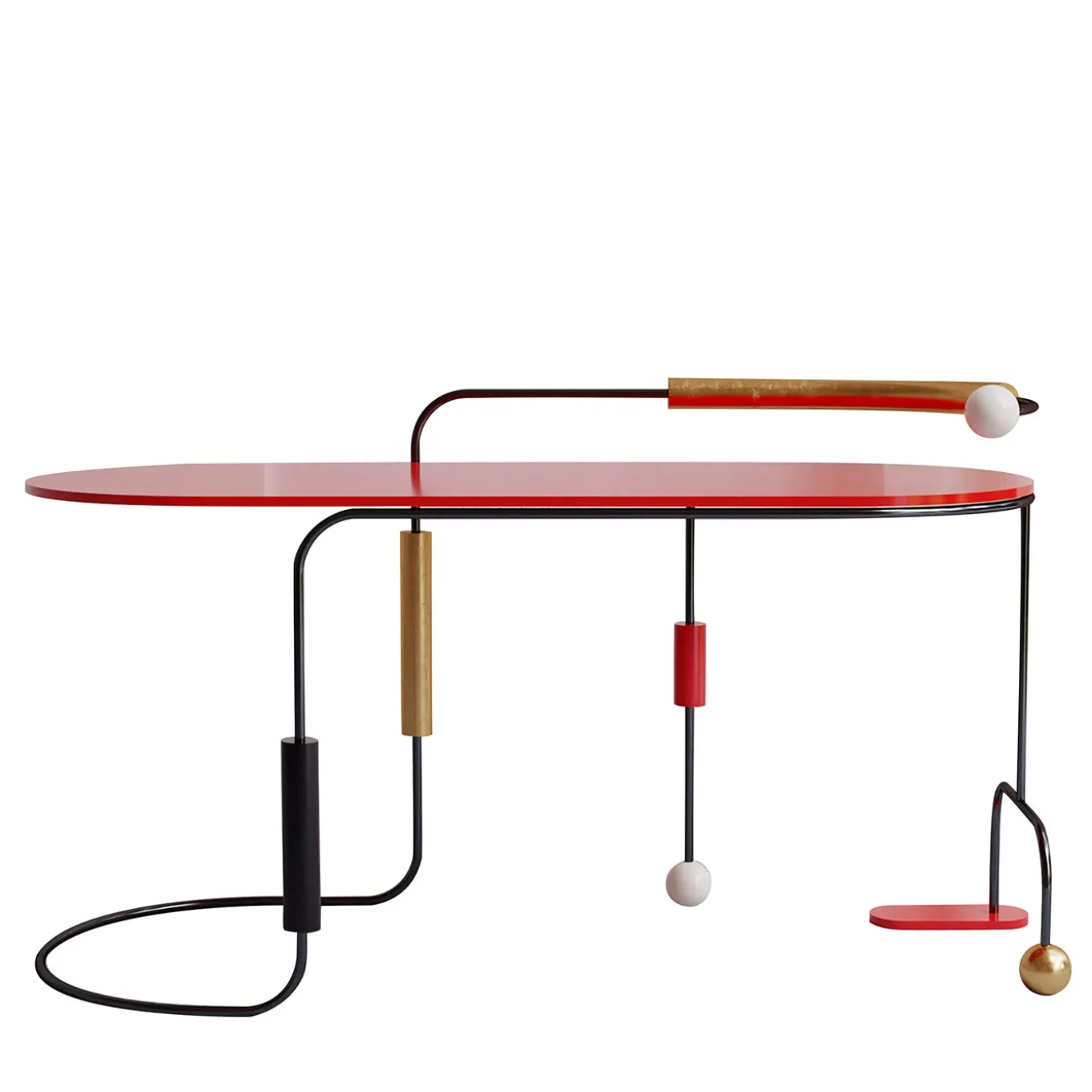 This sculptural desk owes its eccentric design to the dots and dashes typical of the Morse language that names the whole collection. Colorful and dynamic, its asymmetric silhouette with a cylindrical steel frame incorporates cylinders and spheres accented in black, red, ivory, or gold, other than a wide red top marked by rounded sides.