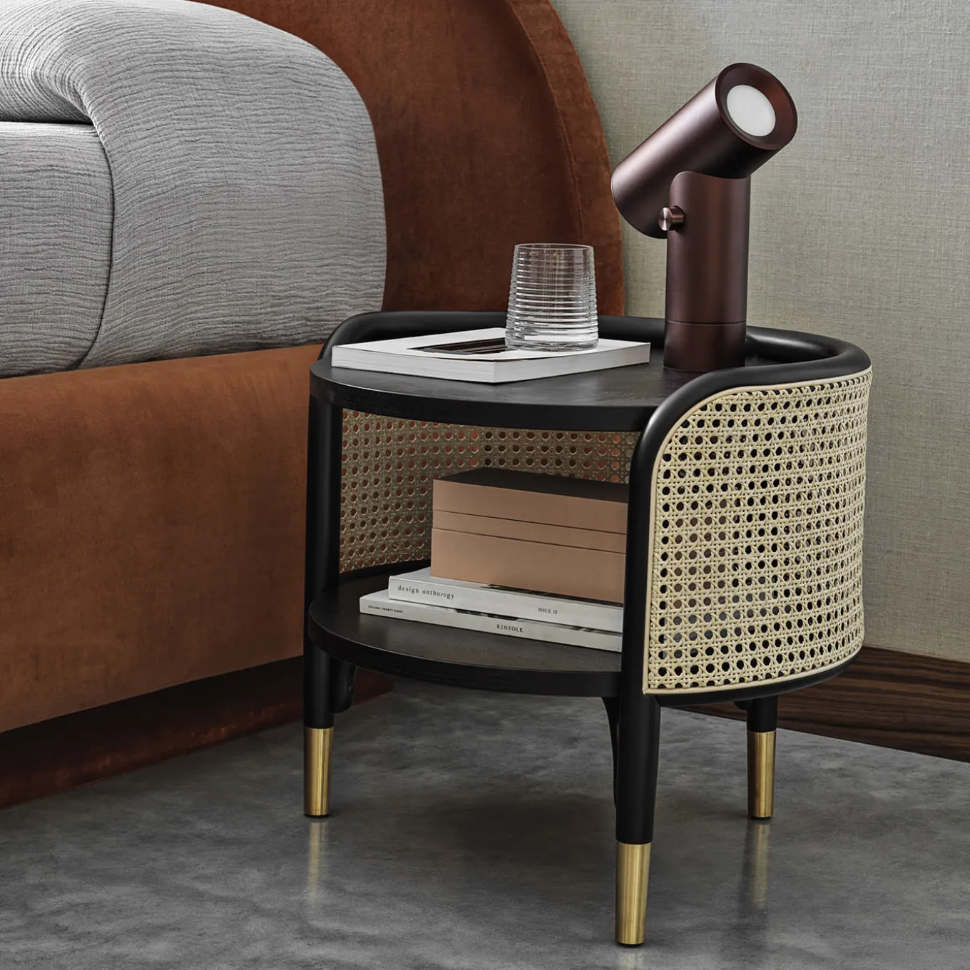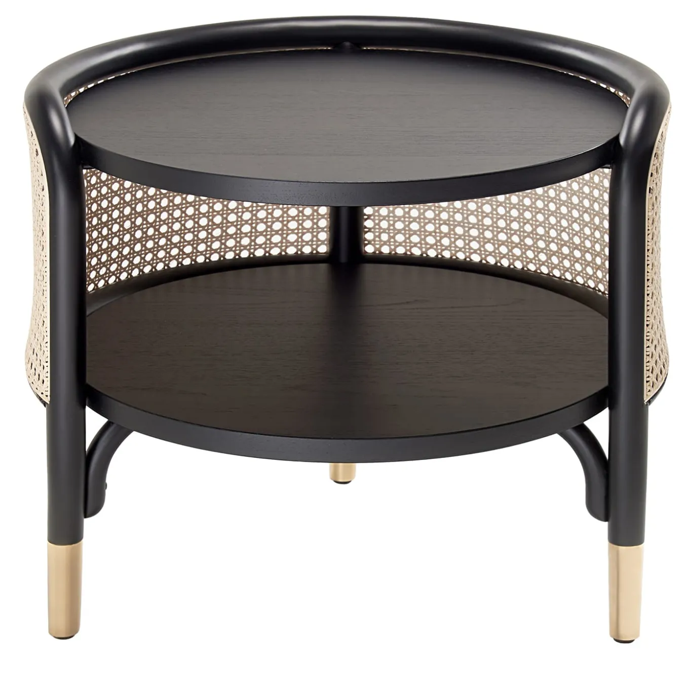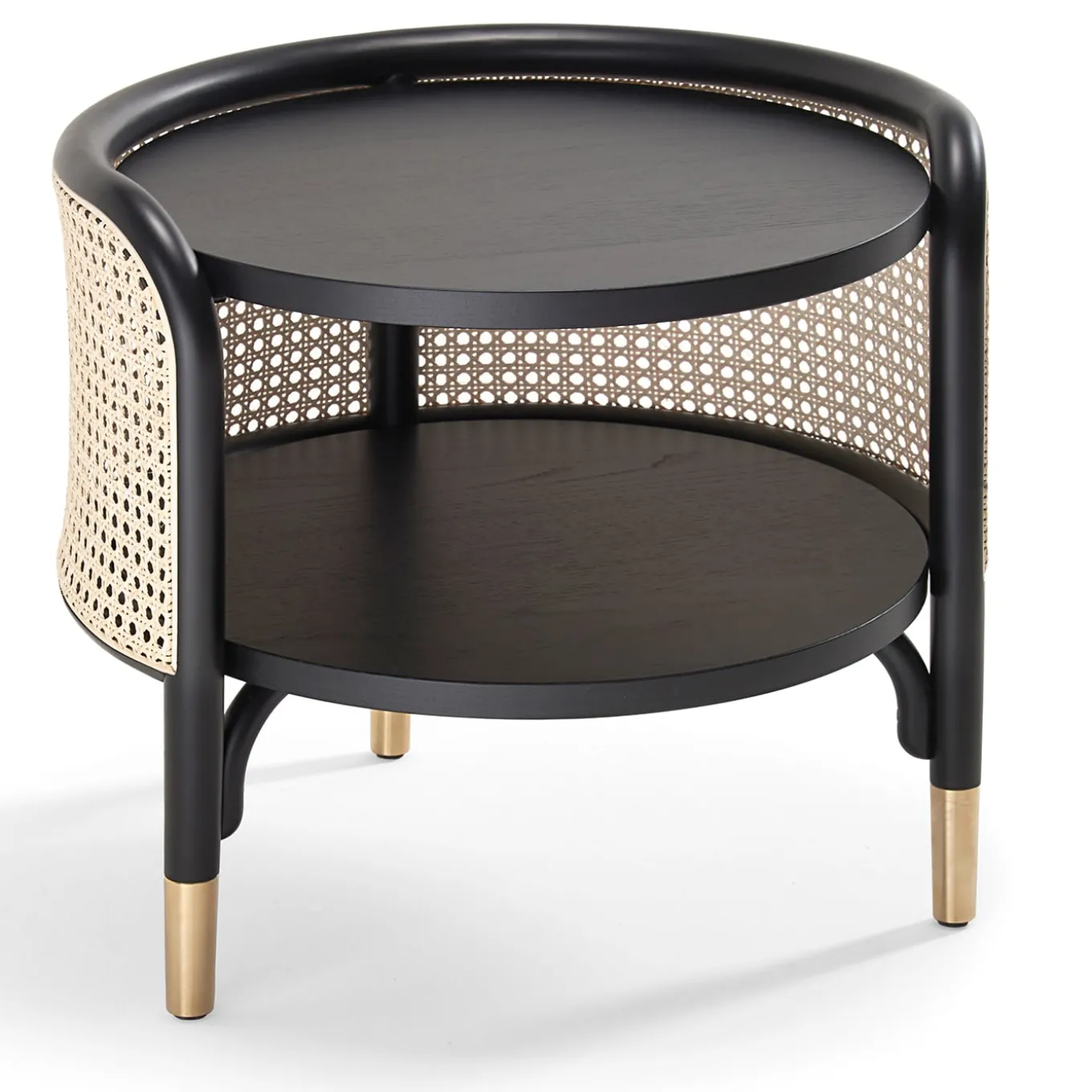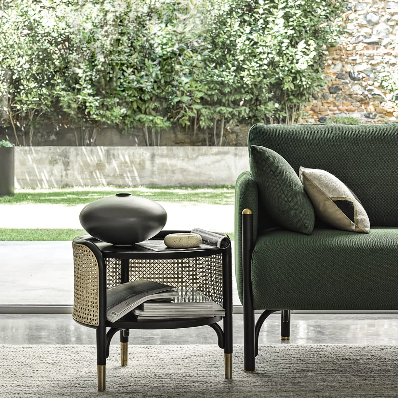 Designed by architect duo GamFratesi, this gorgeous side table belongs to a series of refined and modern furnishing items also comprising a console, cabinet, and bookcase. Either used as a living room side table or bedside table, its airy and elegant design is handcrafted of curved and black-lacquered beechwood and Vienna straw. The entire piece rests on brass feet. Available in a natural finish upon request to the Concierge.