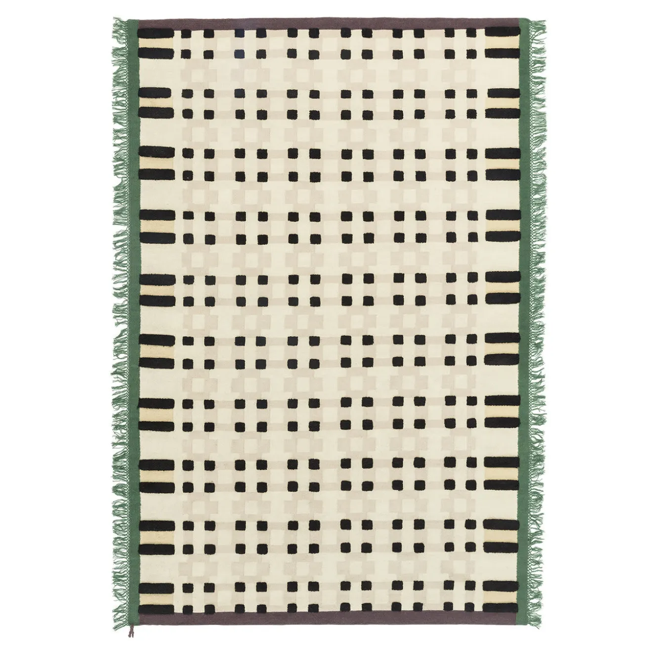 This magnificent rug was designed by Giulia Ferraris and entirely handwoven by expert craftsmen. The decoration reinterprets the mosaic patterns, mixing traditional techniques with a new, contemporary sensibility and creating a series of geometric and modern floral patterns by intersecting lines of different colors. The green and brown edges give an eclectic allure to the piece that is made of 90% wool and 10% cotton. The measurements are 170 x 240 cm or 200 x 300 cm. Customized dimensions are available upon request. Please ask the concierge for details.
