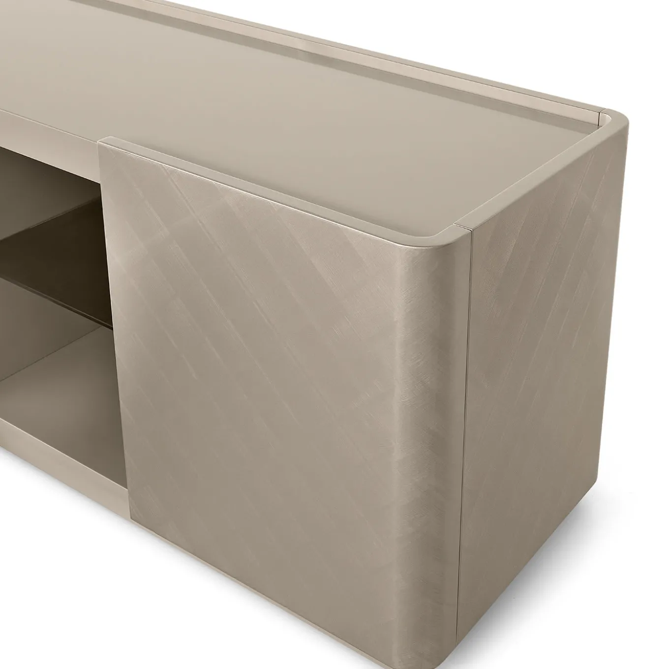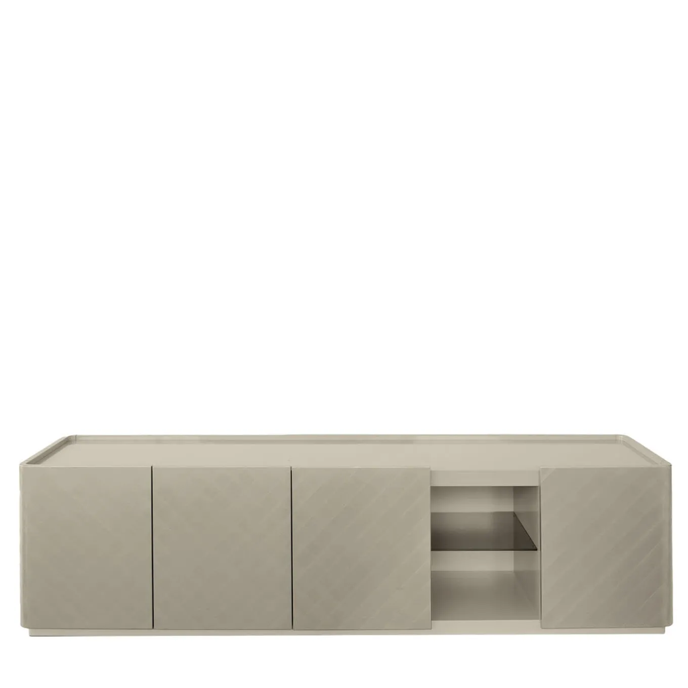 Defined by clean geometric lines, this sideboard will make for a timeless complement to a modern interior, enriching it with comfort and versatility. It features a nickel polyester-lacquered structure finished with a matte texture, enhanced with a “Palladio brushed” crossed motif, visible through the lightened MDF layers, and four doors with magnetic and soft closing opening up to bronze glass shelves and an inner drawer. Please contact the Concierge for more details and customization options.