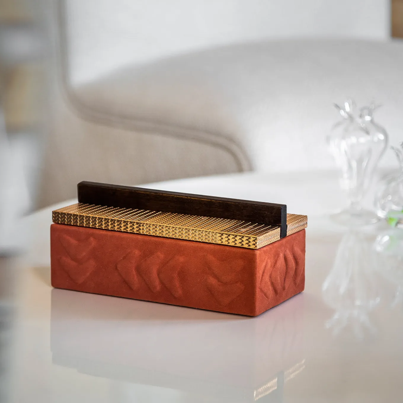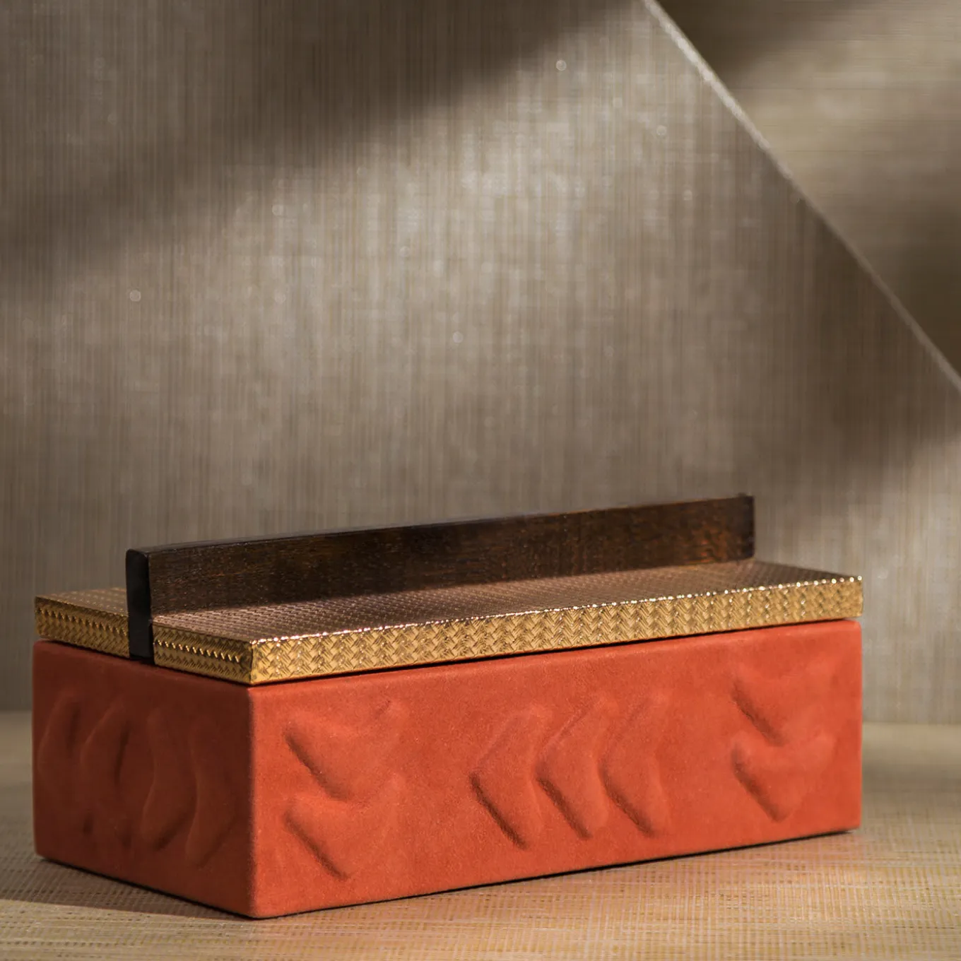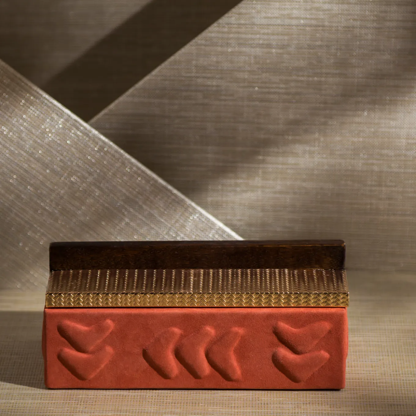 Luxe case for jewel favorites, this box brims with unparalleled tailored flair increased by the combination of fine artistic references. The structure in solid Canaletto walnut displays a raised pattern of figures inspired by pre-Columbian art accented by the tight upholstery in coral-hued Nubuck leather. Its seductive feel matches the sheen of the brass lid, marked by a pleasant mesh-like texture and complemented by a streamlined wooden knob, paying homage to Rationalism.