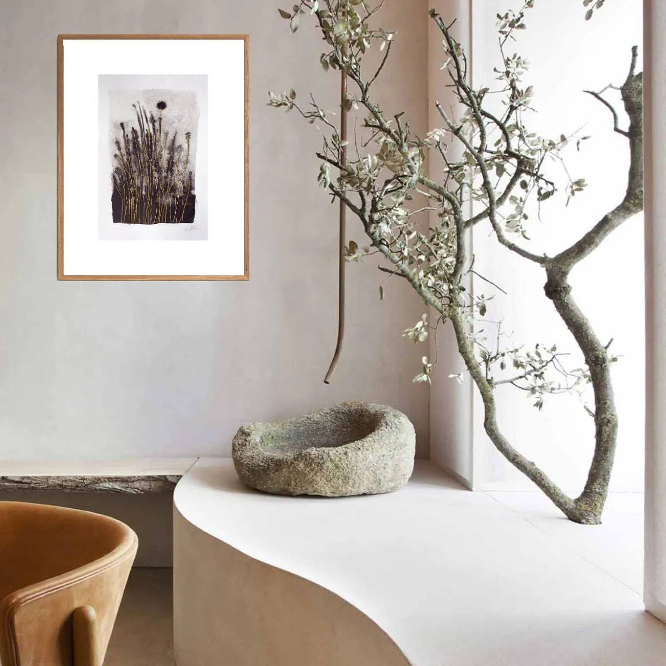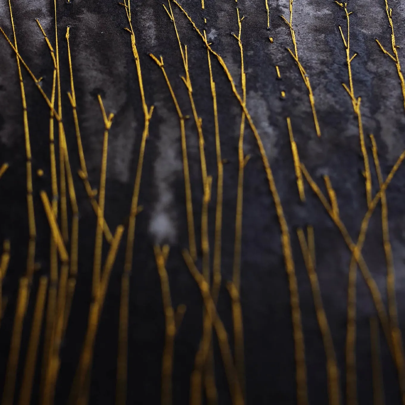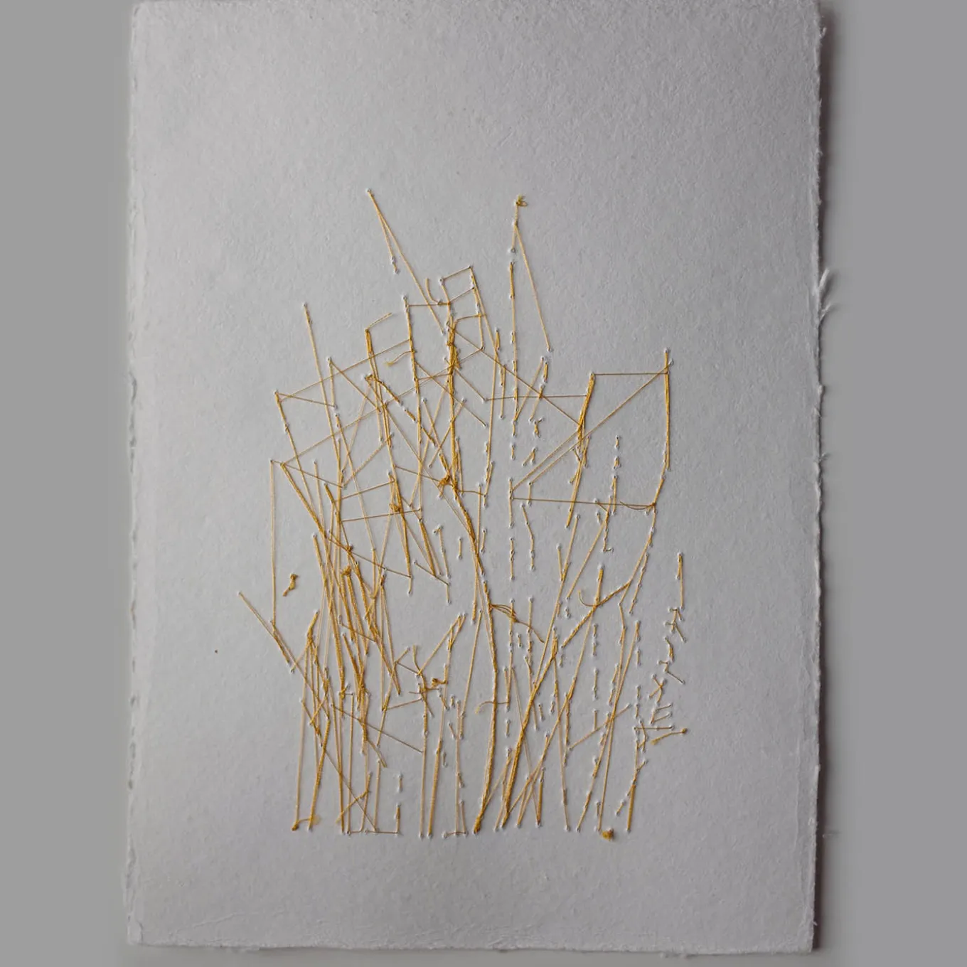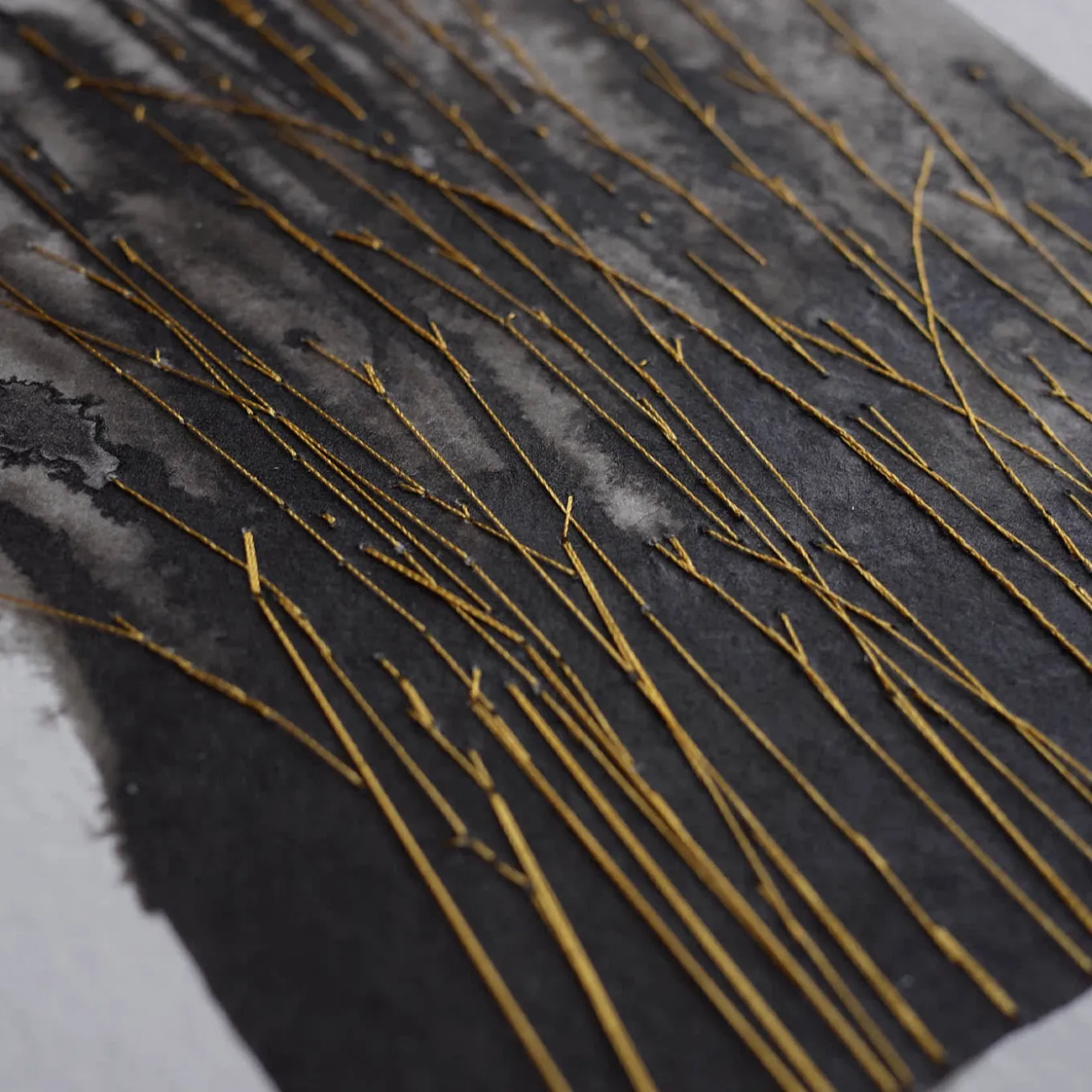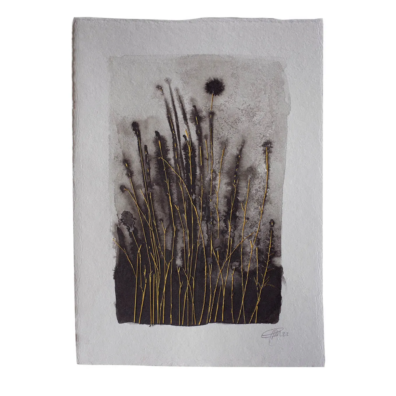 This sublime painting on handmade Andean paper (300 g/mq) depicts a poetic floral glimpse achieved thanks to a clever combination of dark ink and gold thread, used to create stem-like embroideries symbolizing the seeking for light. Choice and randomness ceaselessly intertwine, creating a singular look on both sides. This unique artwork comes without a frame.