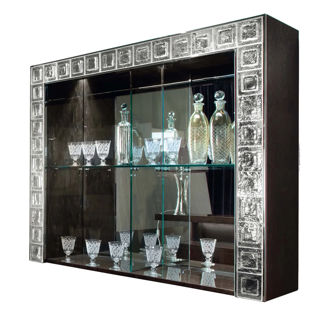 Top only for the credenza/ base with one fixed glass shelf. Led light system with outside blow Venetian glasses inserts. Details in chrome stainless steel. The glasses and goblets in the picture are not for sale.