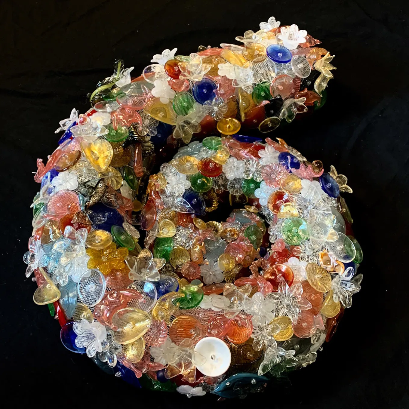A skillfully restored vintage Murano sconce, this delightful one-off objet d’art showcases a remarkable iron-crafted nautilus shell structure with welded wire mesh. Embellished by Murano decorative ornaments were inserted in the netting, including seashells, fish, and marine life sculpted glass. Use with E14 bulbs, it is equipped with brand new electrical wiring.