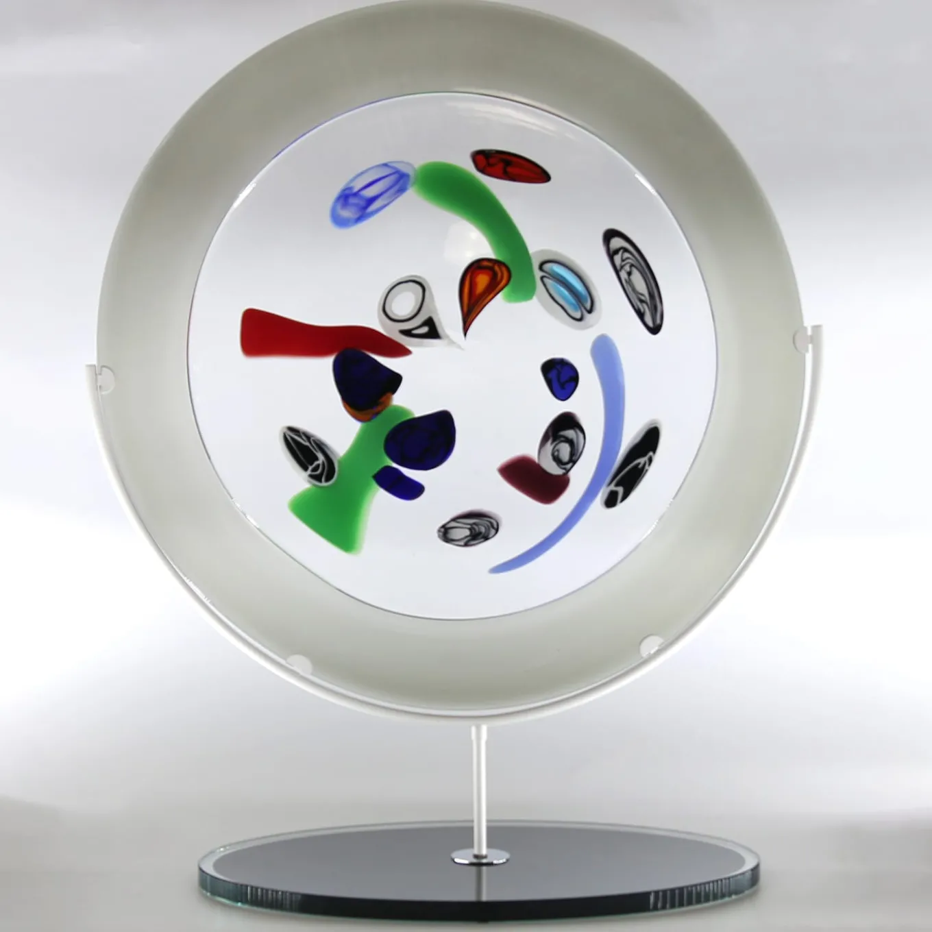 This splendid and modern designed decorative plate is completely handcrafted in Murano by master glassmakers of Venezia. This decorative plate is the ideal complement for the decor of a home, an office or a studio. It is delivered with the pedestal and a certificate of origin.