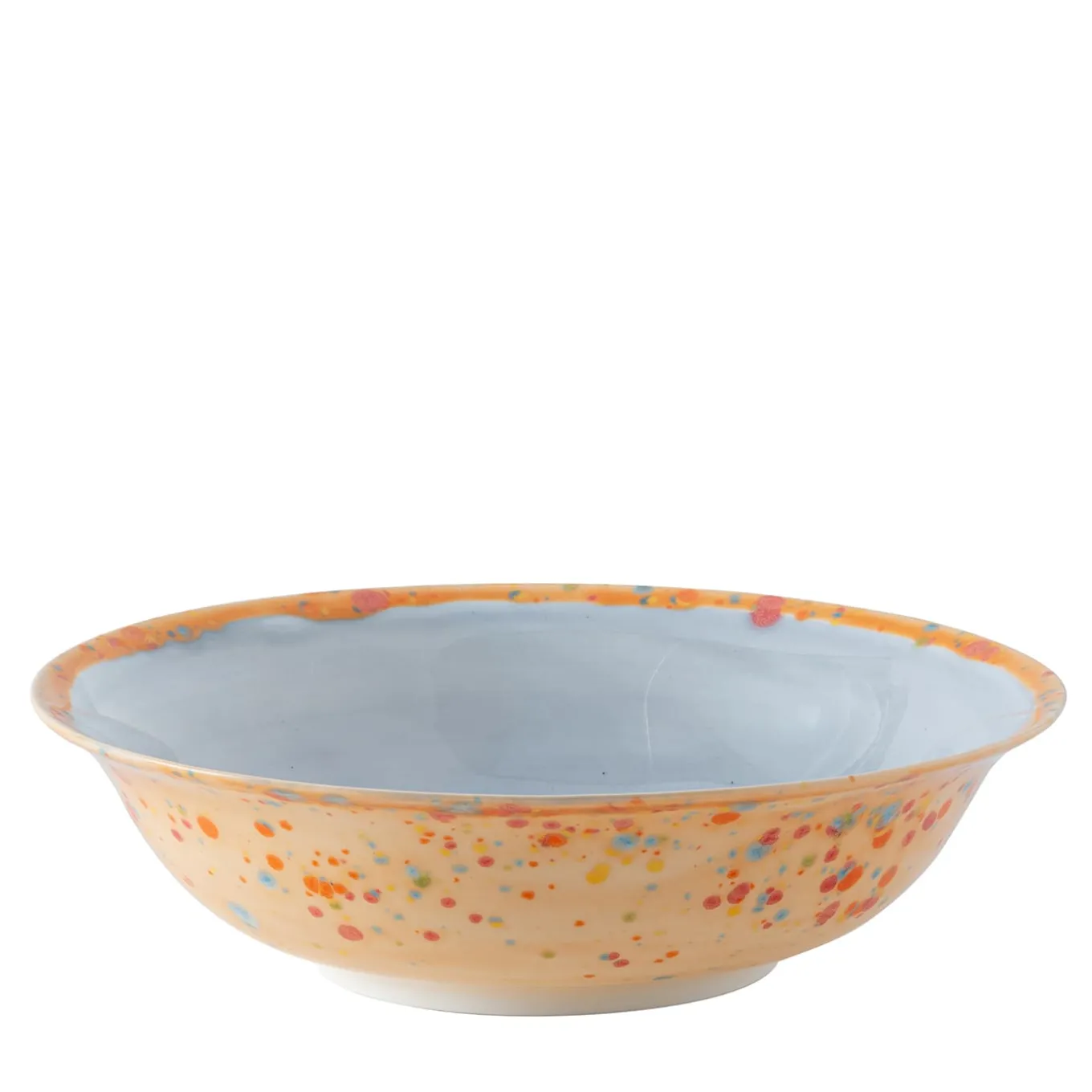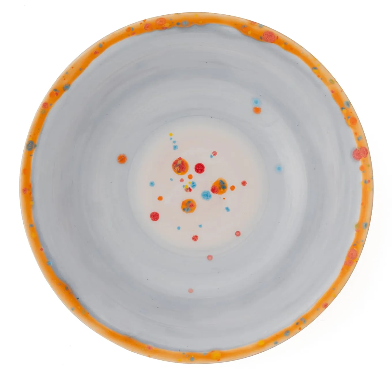 The Murrine Salad Bowl is a stunning piece inspired by the vibrant artistry of Venetian glass, reminiscent of intricate kaleidoscopes. Its soft gray hue brings an elegant touch to any setting, embodying sophistication and serenity. The design features Murrine patterns that gracefully open and disperse along the edges, resembling colorful flower seeds in gentle motion. Part of a collection that includes yellow, green, and lilac.