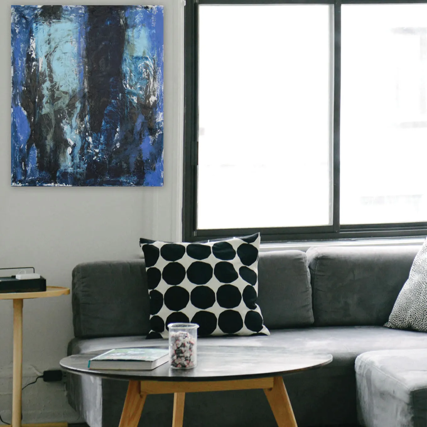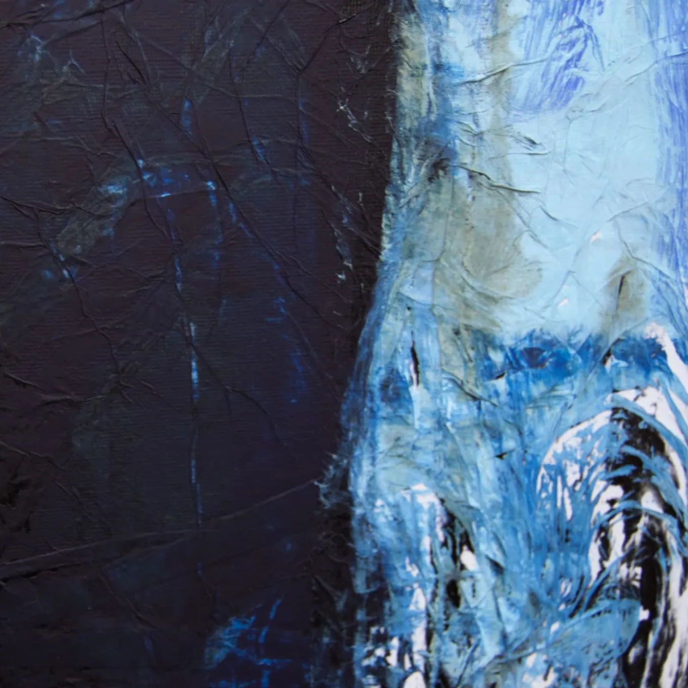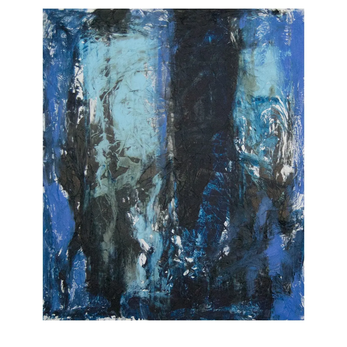 Dynamic acrylic brushstrokes in an intense palette of blues with dark secure accents that evoke authentic movement from top to the bottom lend this painting a sense of wait. Acrylic matter characterizes the entire piece with its texture, a result enhanced by the underlying layer of tissue paper glued to the canvas. The piece is delivered unframed and is supplied with an authenticity certificate.