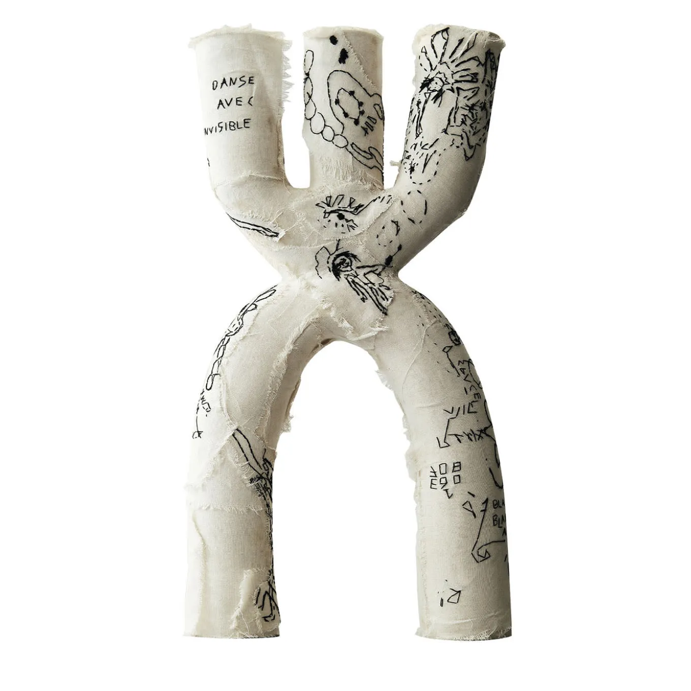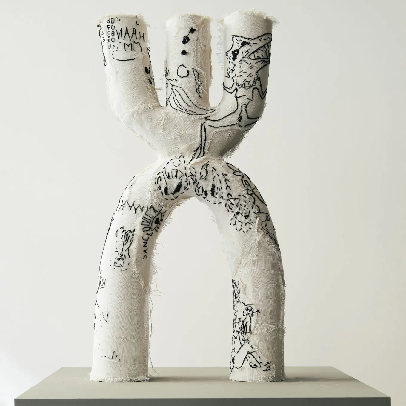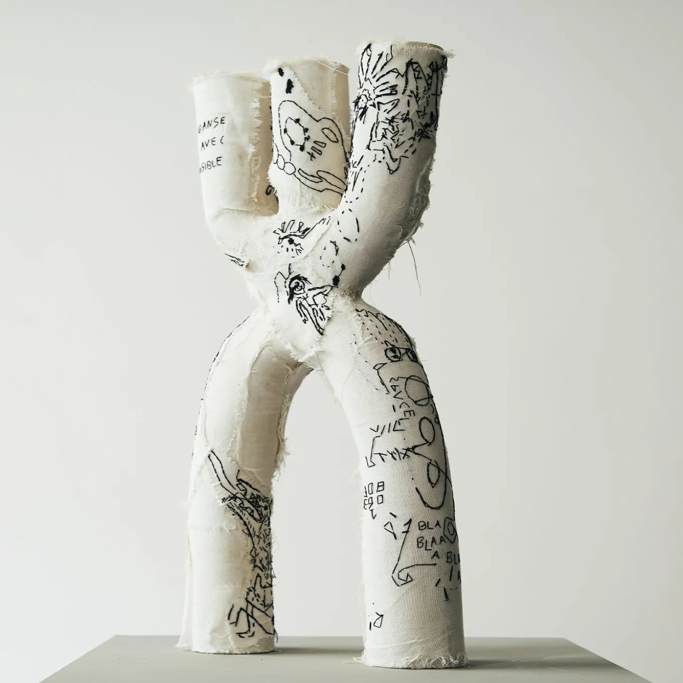 A unique handmade piece, this sculptural vase is created with white stoneware, using the coiling technique. The object is enriched by embroidery with black yarn on a cream light fabric.