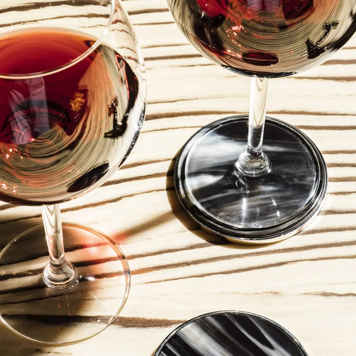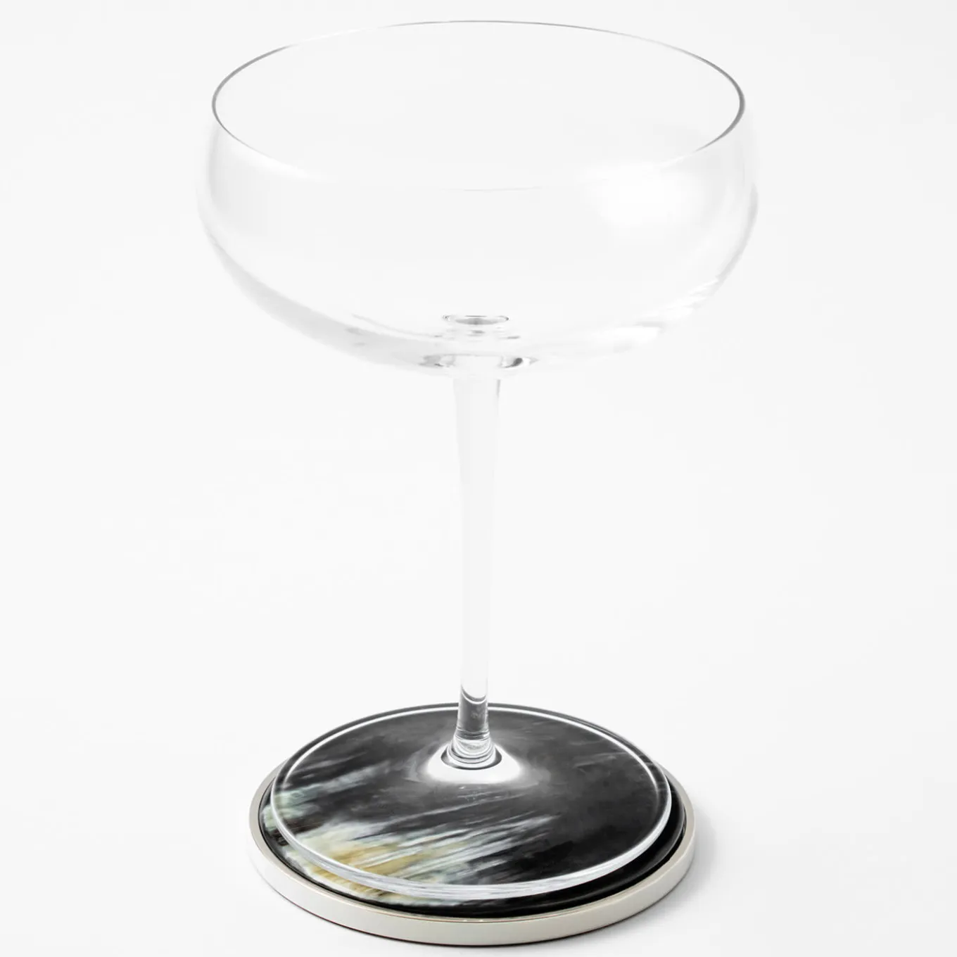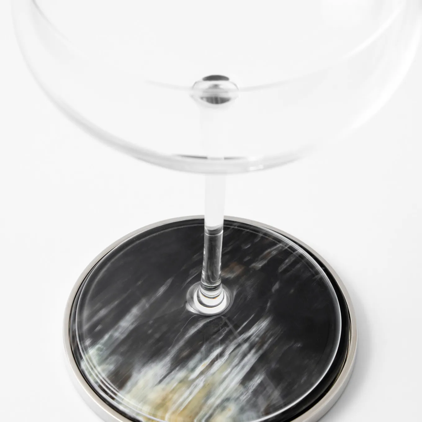 Hand crafted in Natural White Black Horn, this luxurious Set of 6 Coasters is waxed to maintain its natural properties. The horn may feature slight variations in size and in color that contribute to the unique and sumptuous quality of the item as it is a natural product. The base is made in nickel-plated brass, complimenting the natural horn. Part of the Weaving Collection.