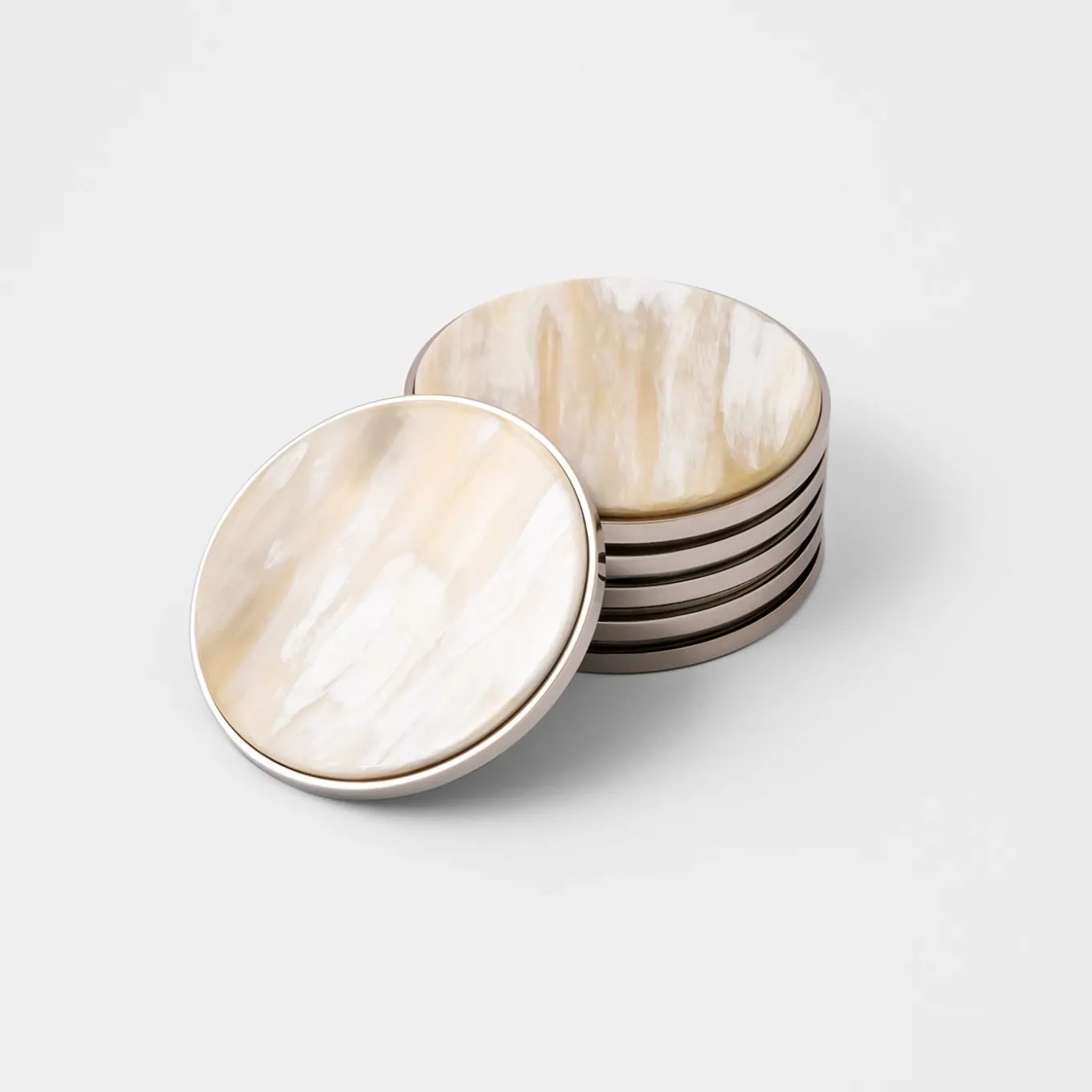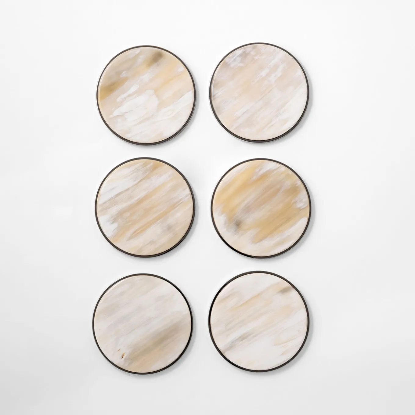 Waxed to maintain its natural properties, this luxurious Set of 6 Coasters is hand crafted in Natural White Blond Horn. Being a natural product, the horn may feature slight variations in size and in color, all contributing to the unique and sumptuous quality of the item. The base is made in nickel-plated brass that compliments the horn magnificently. Part of the Weaving Collection.