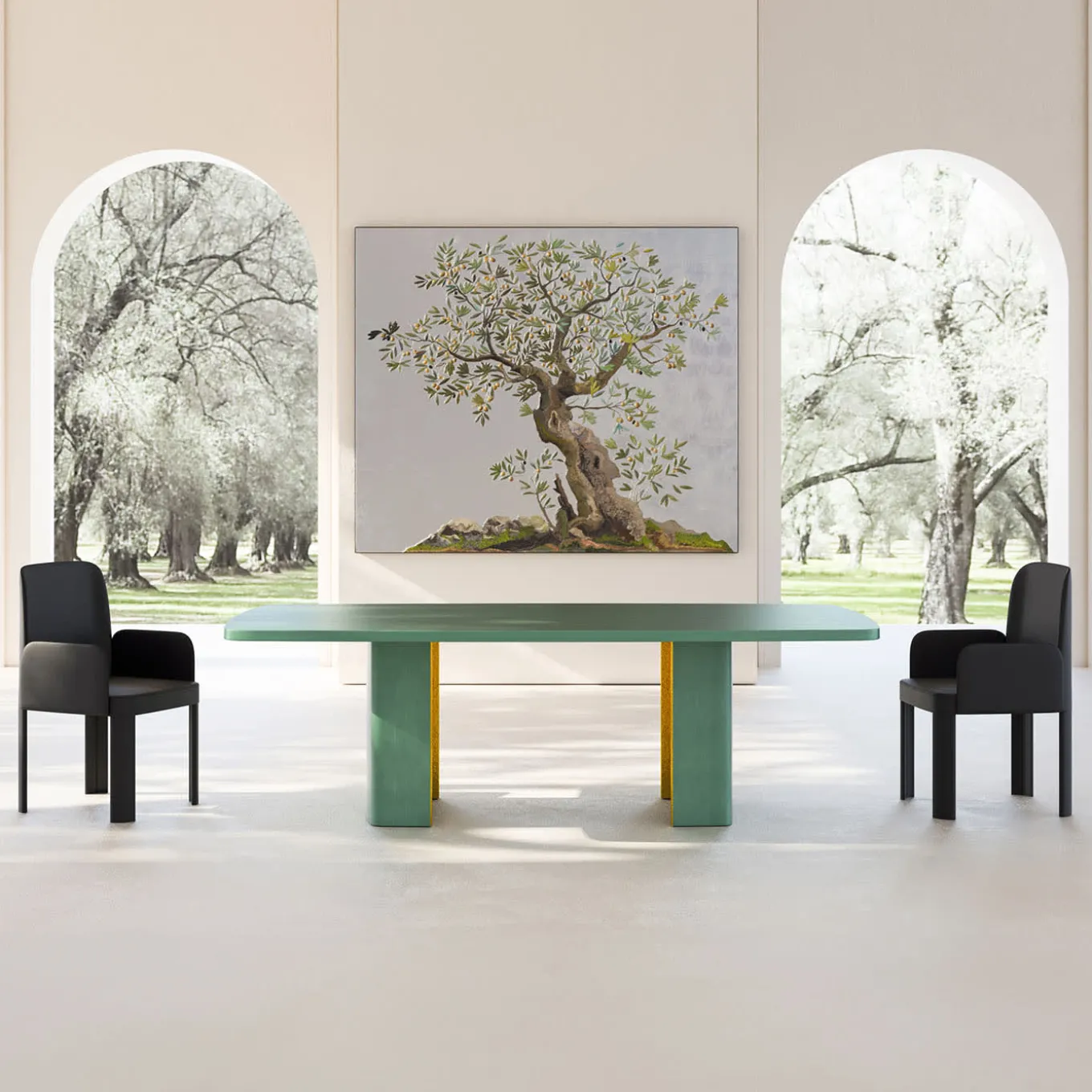 Clean lines and delicate rounded corners trace the silhouette of this refined contemporary table, which owes its eye-catching look to a daring chromatic combination. A special “scagliola” plaster finish characterizes the top and C-cut legs, their interior offering an unexpected luxurious accent thanks to the hand-worked textured brass plating. Please contact the Concierge for customization options.