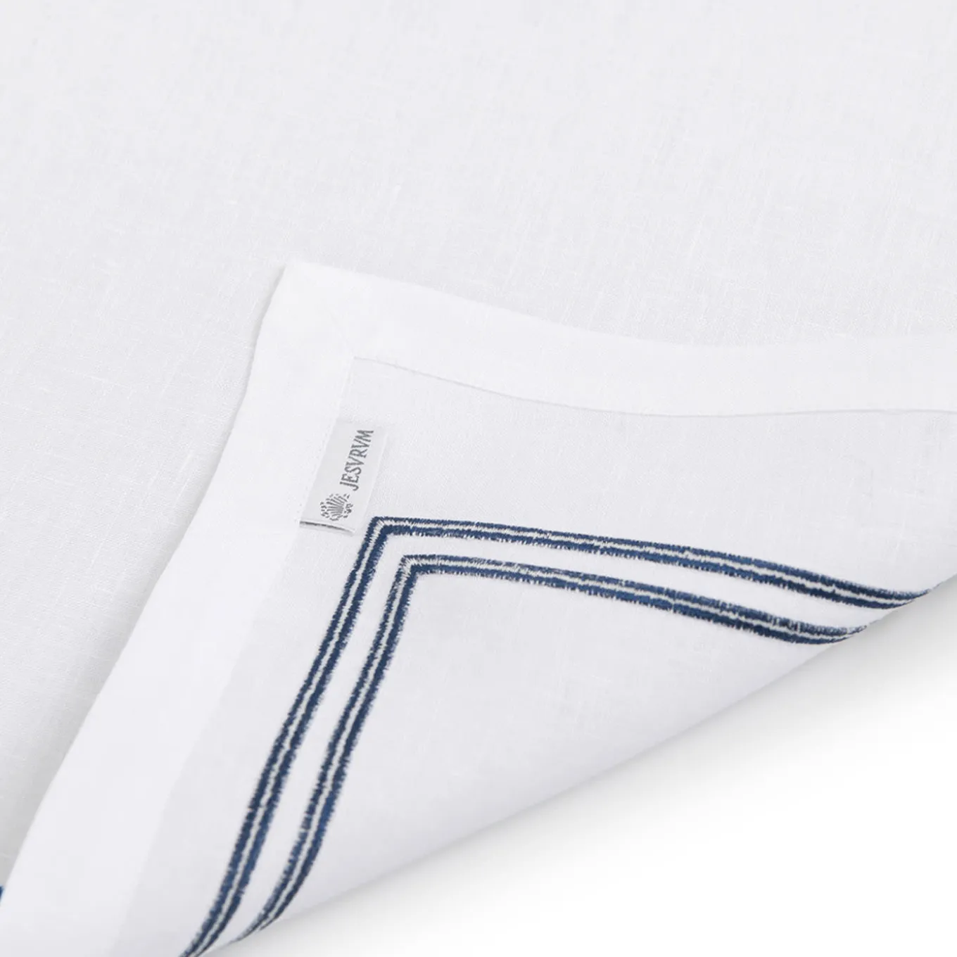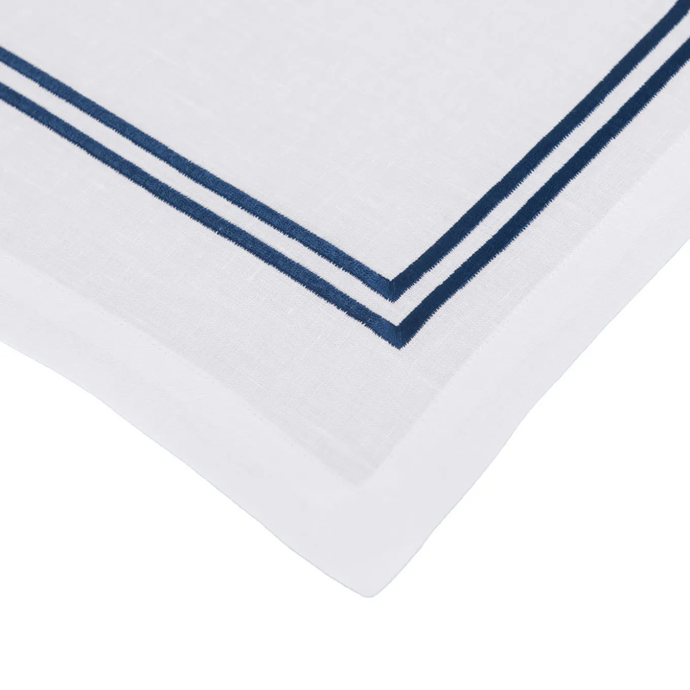 Merging traditional craftsmanship with a refined contemporary flair, this exquisite placemat will make a timeless accent piece for an elegantly set dining table. Exuding a clean geometric aesthetic, it is handmade of the most precious white linen enriched with a blue embroidery tracing its rectangular profile.