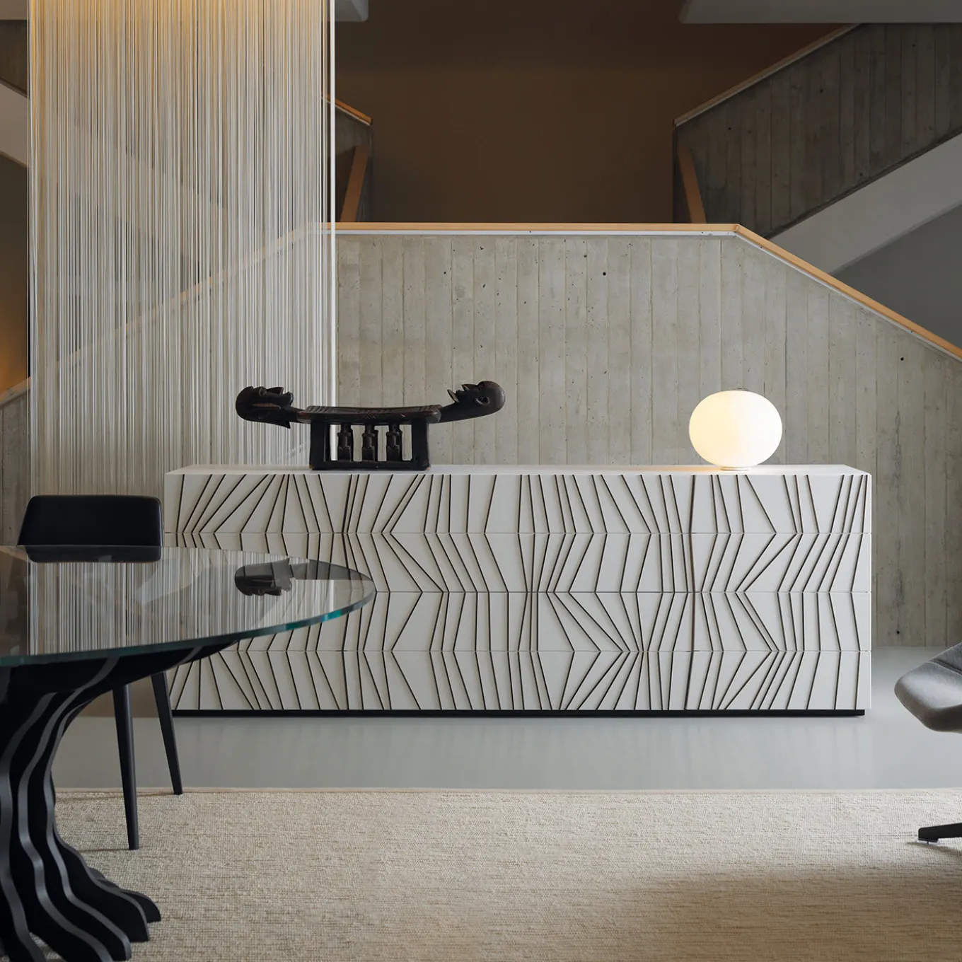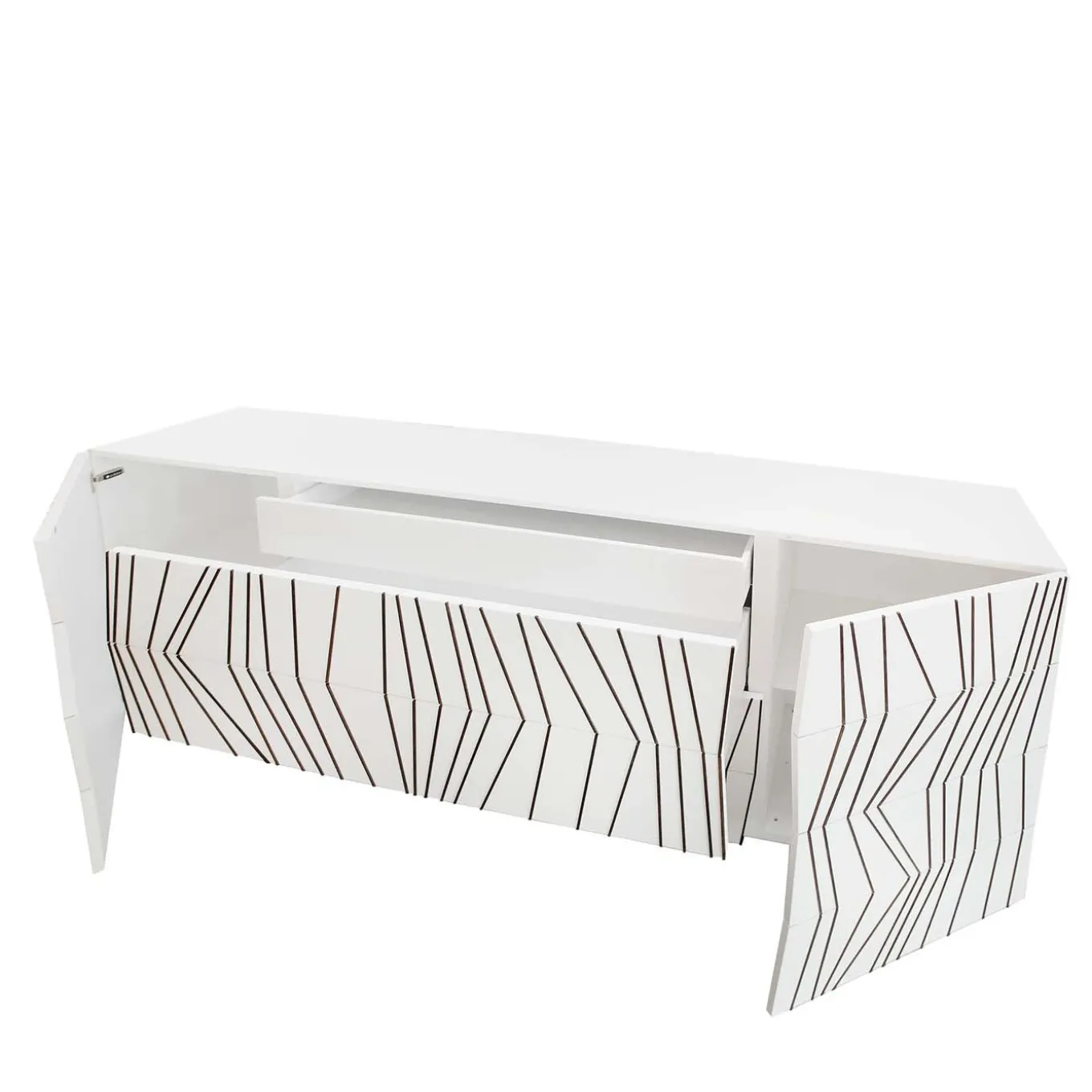 This captivating sideboard is a sophisticated piece of decor that will make a statement in any contemporary interior. Handcrafted of ash wood, it features a matte white lacquered finish enriched with embossed geometric lines. The frame is composed of four sections: two side doors and two sets of drawers in the middle, equipped with a push-pull opening mechanism. An additional drawer is hidden inside right below the top for added storage.