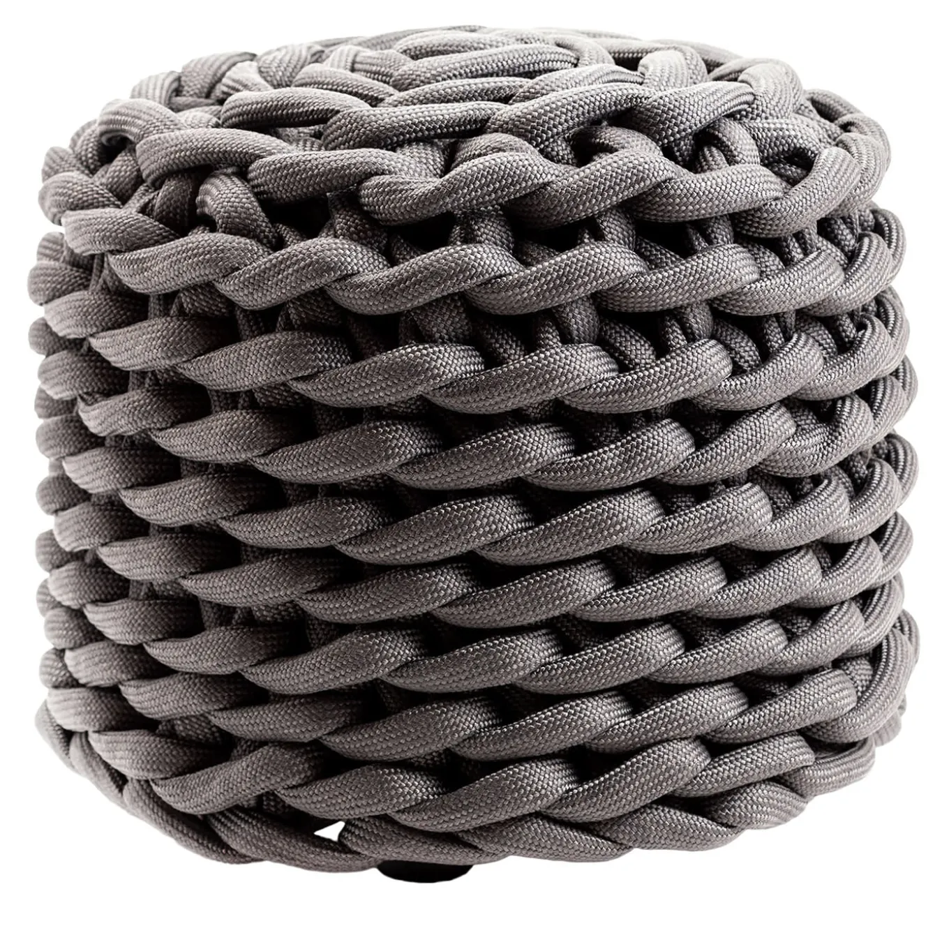 This round pouf, designed by Rosanna Contadini, offers a sophisticated and stylish addition to outdoor spaces. It is handmade of waterproof materials (polypropylene, polystyrene, and Lycra fiber) and covered in deftly hand-knotted 22mm-thick gray-colored polypropylene rope. Its compact design underscores its versatility: it can be used as a footstool, additional seating, accent table, or decorative accessory. Please contact the Concierge for more details.