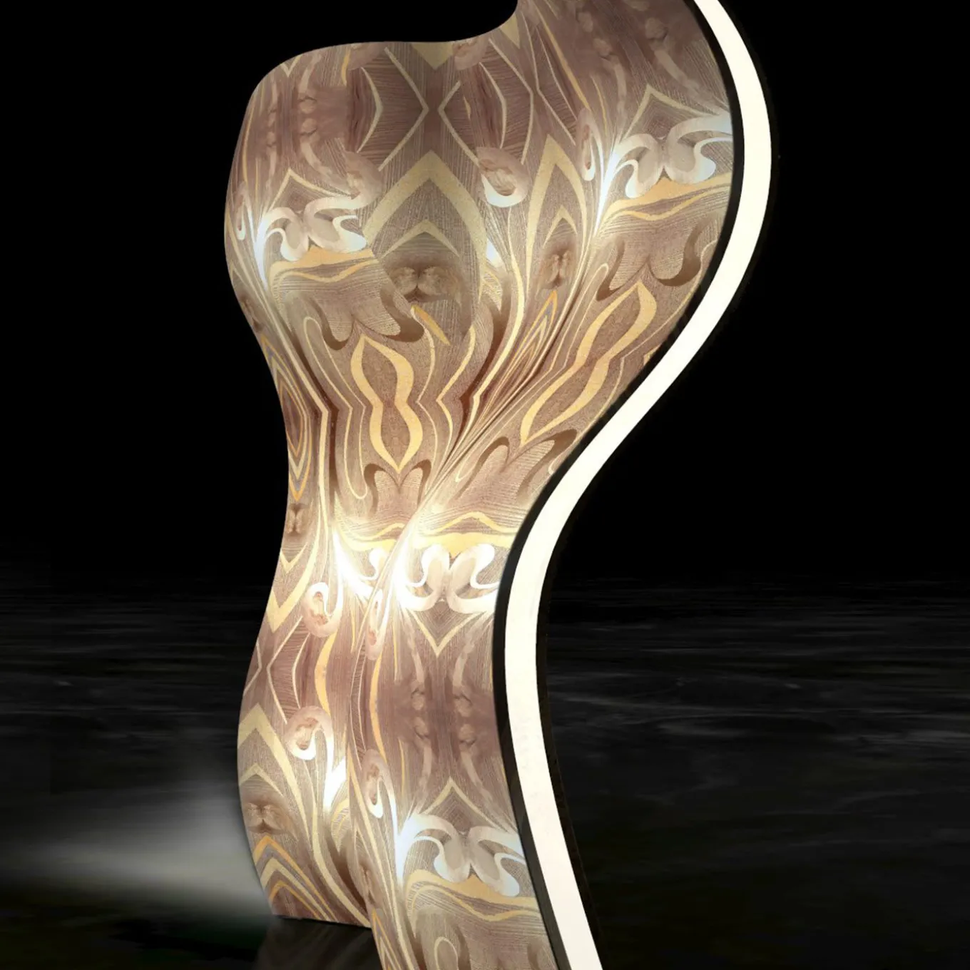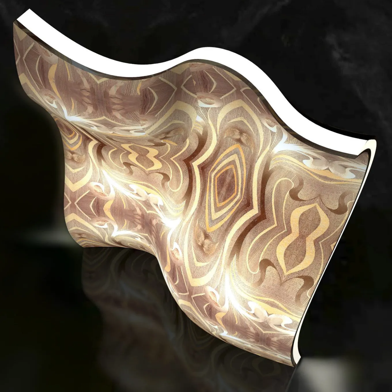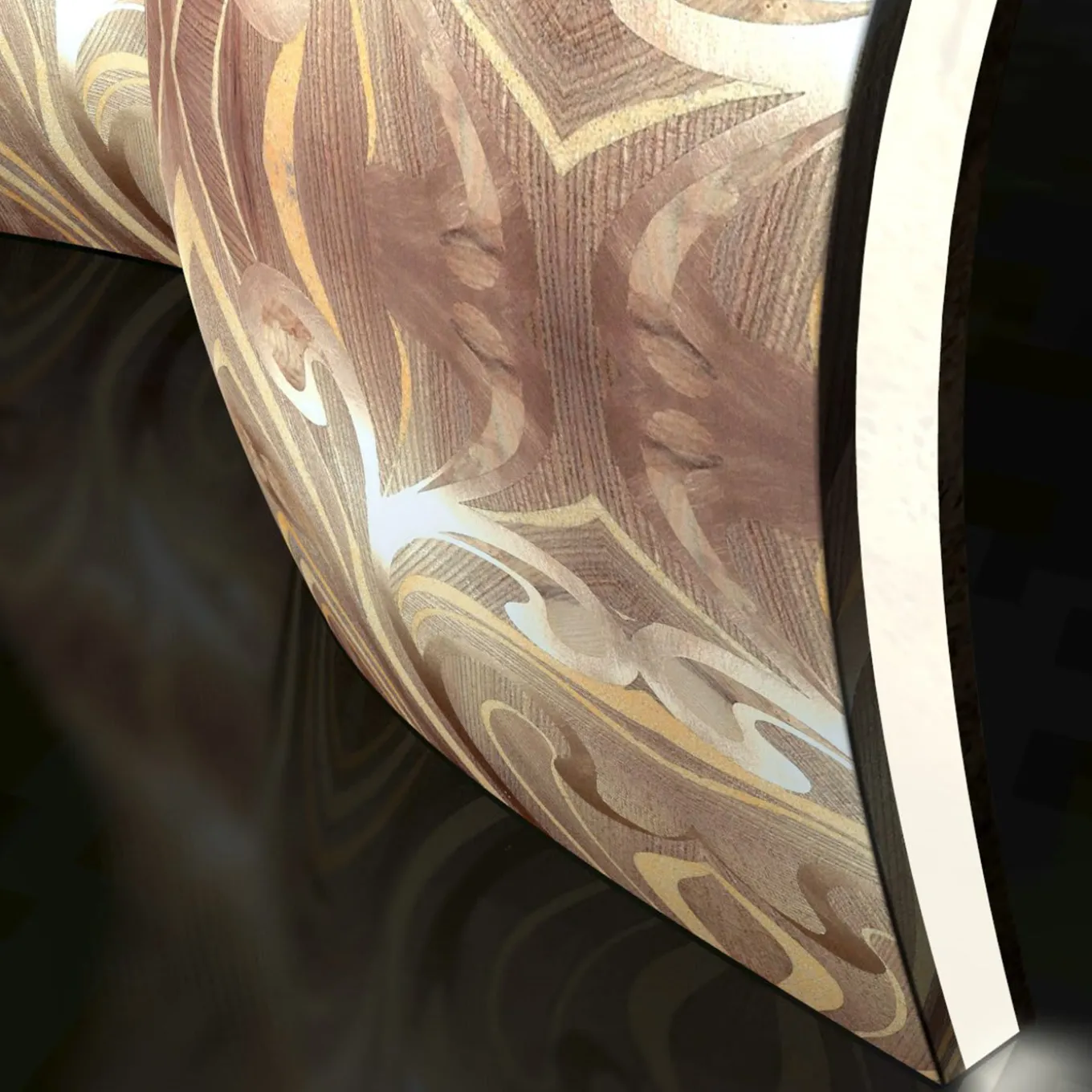 A contemporary reinterpretation of Art Nouveau, the Neo Room Divider is a stunning addition to a grand living room or lobby area. Featuring inlays in pure wood, marble and bronze, the entire divider is illuminated by its borders to draw in attention, even from across the room. For a finishing touch, the entire back side is coated in polished bronze.
