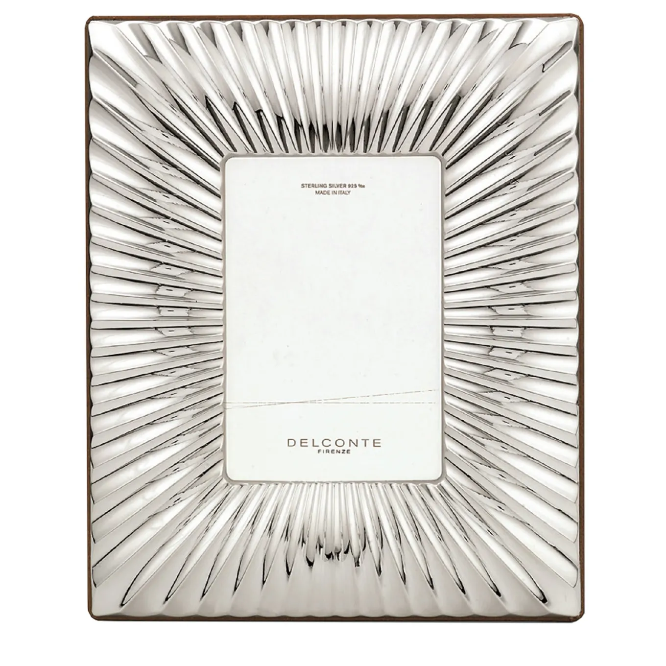 A sunburst motif of grooves defines the alluring aesthetic of this frame, fashioned of sterling silver 925 offered in a lustrous finish. The back and supporting elements are luxuriously upholstered with natural leather to imbue the general design with increased opulence. A timeless display for unforgettable memories, the piece fits 13×18 cm photographs but is also available in different size variants for 9×9- and 10×15-cm photos.