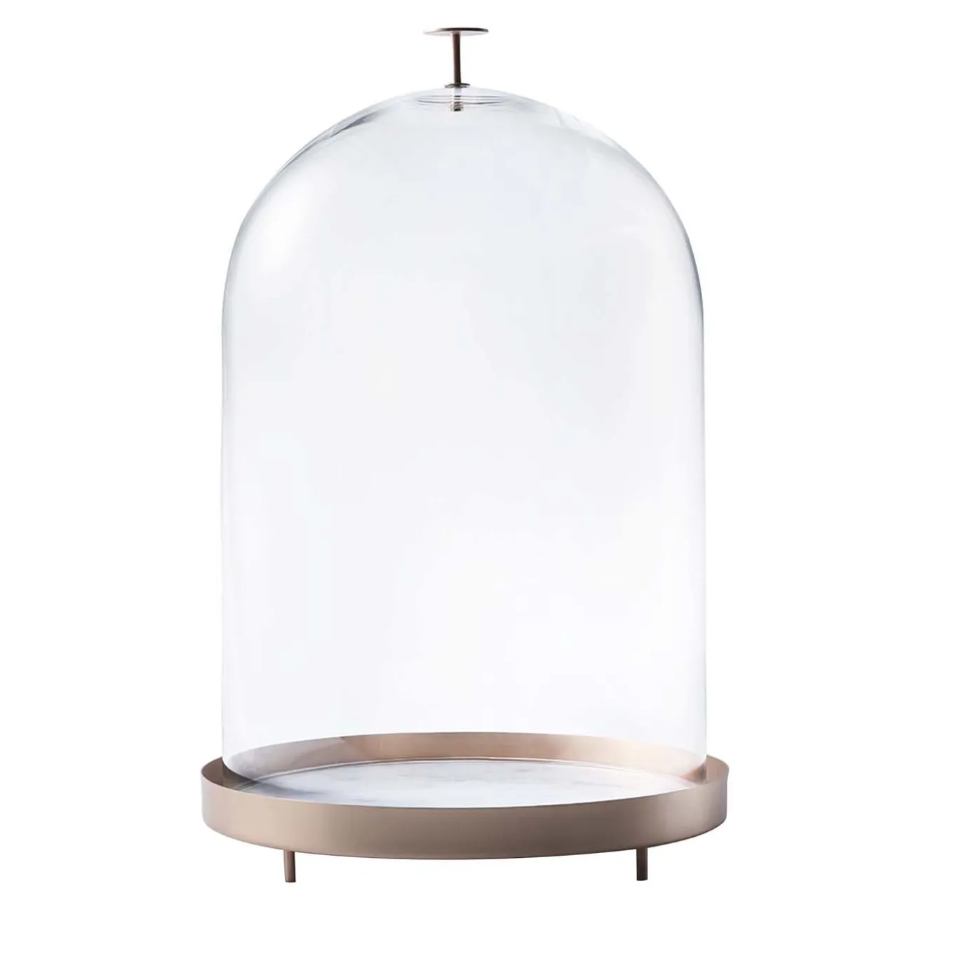 Modern and sophisticated, this piece was designed by Elisa Ossino for Paola C. and is part of a collection inspired by the quiet elegance of lunar landscapes. The elongated shape of this glass bell rests on a refined Carrara marble base. The edges of the base and the handle of the bell are in copper, to add a touch of blushing color to the piece. Either alone or paired with the New Moon Glass Bell, this object will be a versatile display case for food or collectibles.