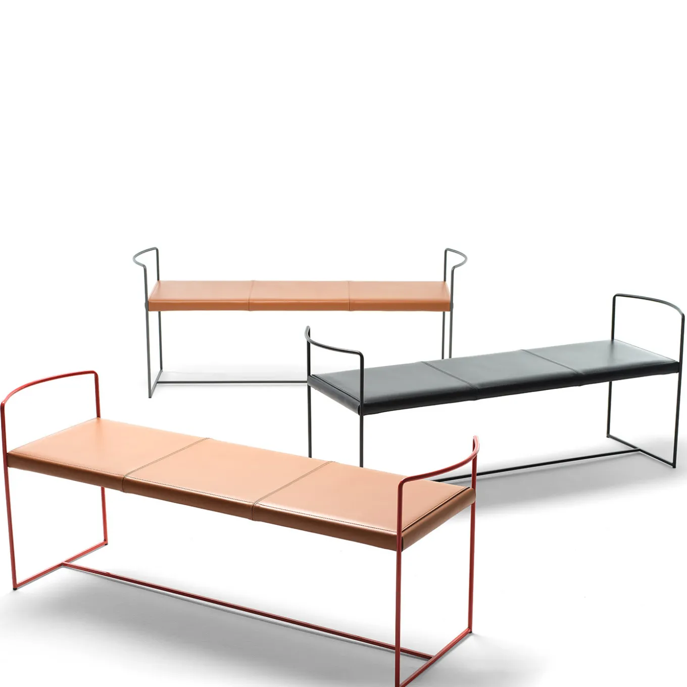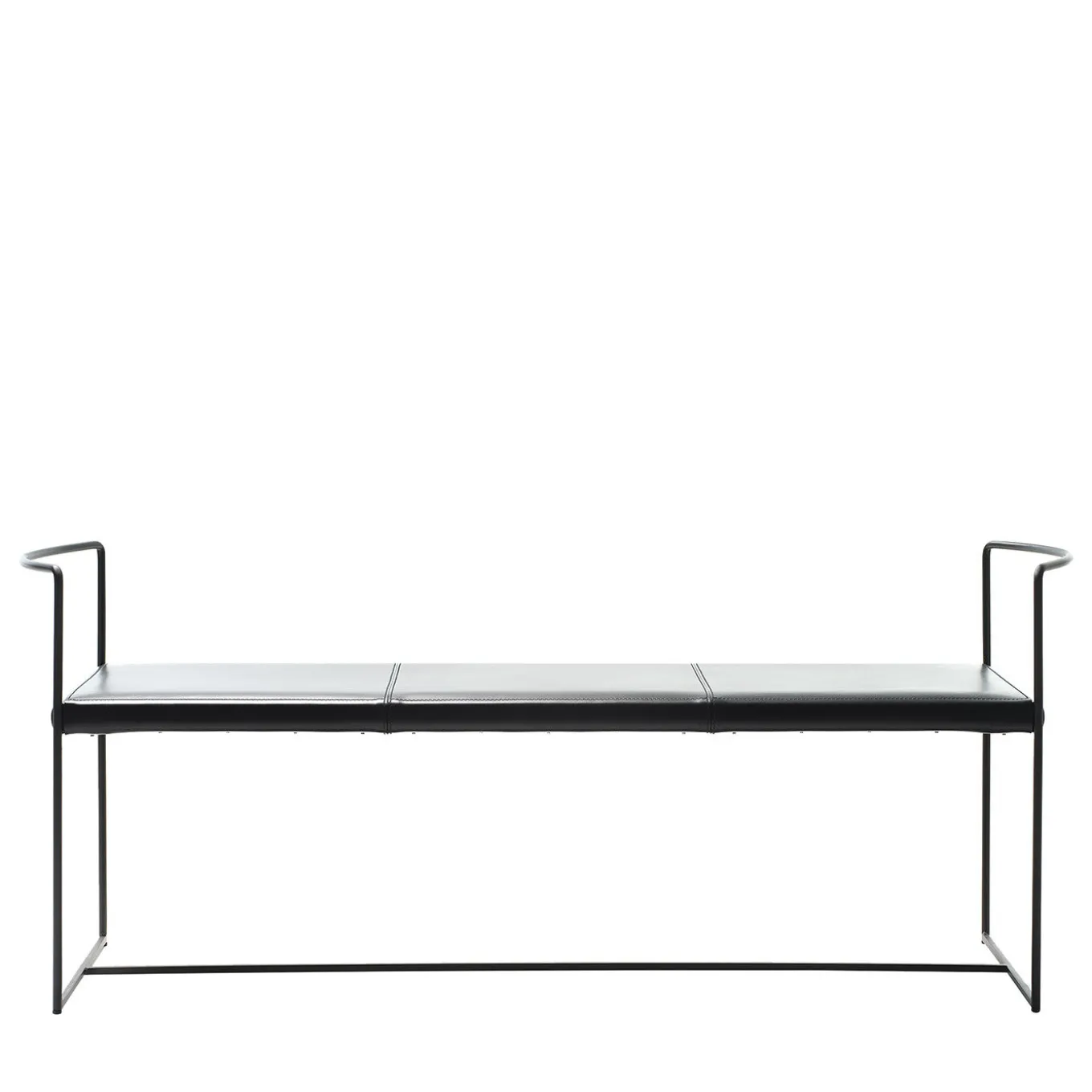 An intriguing interplay of solids and voids defines the refined character of this bench, whose perfectly contoured frame is crafted of black-painted steel rod. The armrests flanking the wide seat are covered with black-hued cowhide and flaunt a delicately curved top profile that interrupts the overall rigorous look. Hidden elastic belts provide excellent stability. Please ask the Concierge for available customization options.