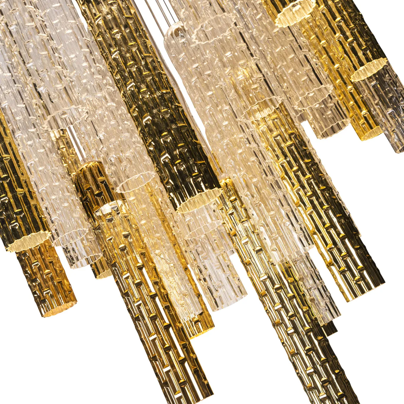 Comprised of handcrafted Murano glass cylinders that combine transparent finishes with shiny and refined 24K gold ones, this magnificent chandelier will make for a bold addition to an elegant interior setting. The ceiling rose is in gold-lacquered metal and features five LED lighting sources (LED 60° GU10 – 7W), combined with the LED lightbulbs inserted in the cylinders (LED 36° GU10 – 7W).