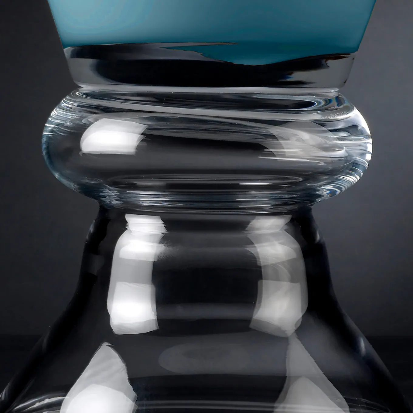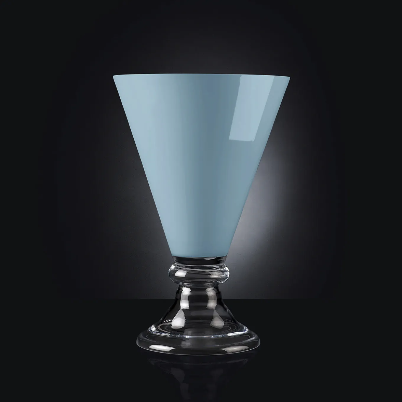 A superb interplay of clean and elegant lines and delicate, polished hues, this vase is part of a timeless and versatile series suitable for both modern or classic decors. Masterfully handcrafted by expert artisans, it features a clear glass round base, supporting a blue cone-shaped top.