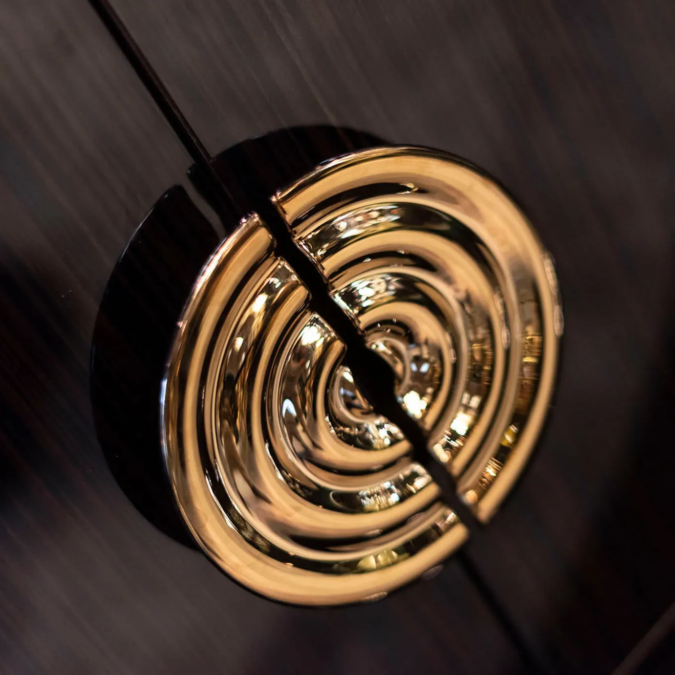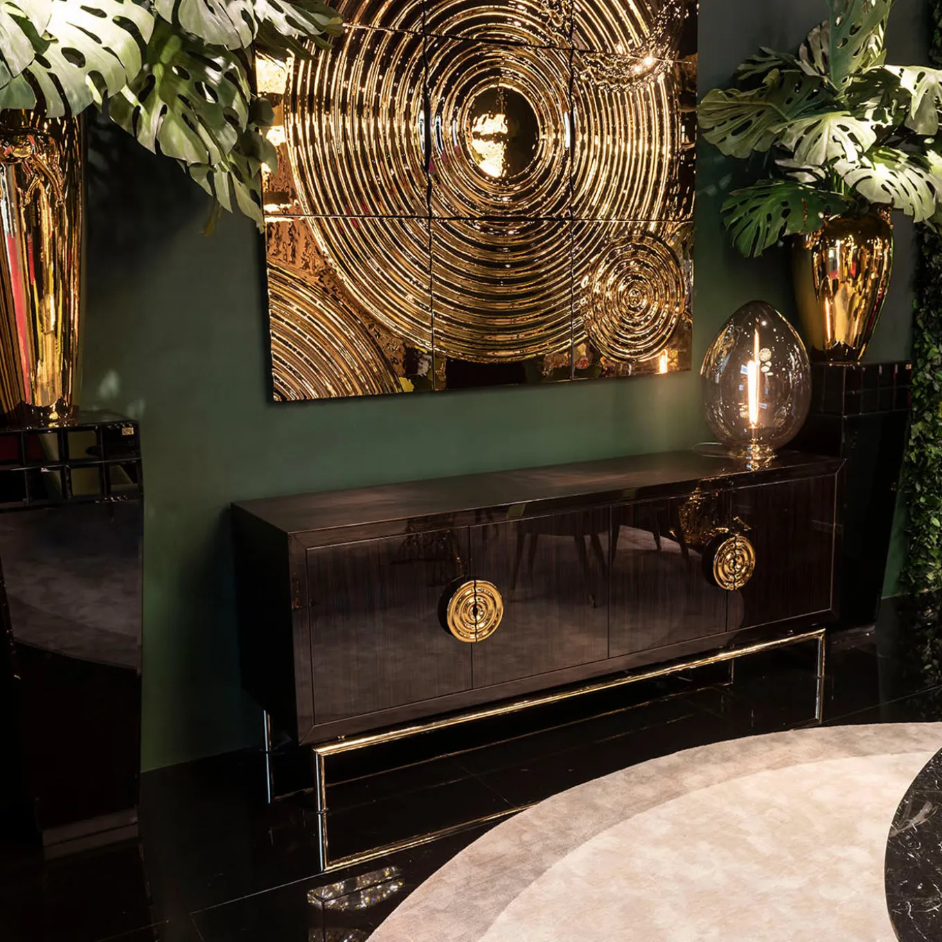 A chic solution for storage in dining and living rooms, the New Secret Sideboard exudes a refined and graceful aesthetic showcased by a modern tubular metal base with a polished 24k-gold finish. Crafted of honeycomb ebony with brushed 100 Gloss finish, it features a 20″ glossy frame enclosing the 4 doors equipped with the soft-closing Salice system and embellished with exclusive VG golden glass handles. The matte lacquered interior has a mirrored back and shelves (one in wood and two in glass).